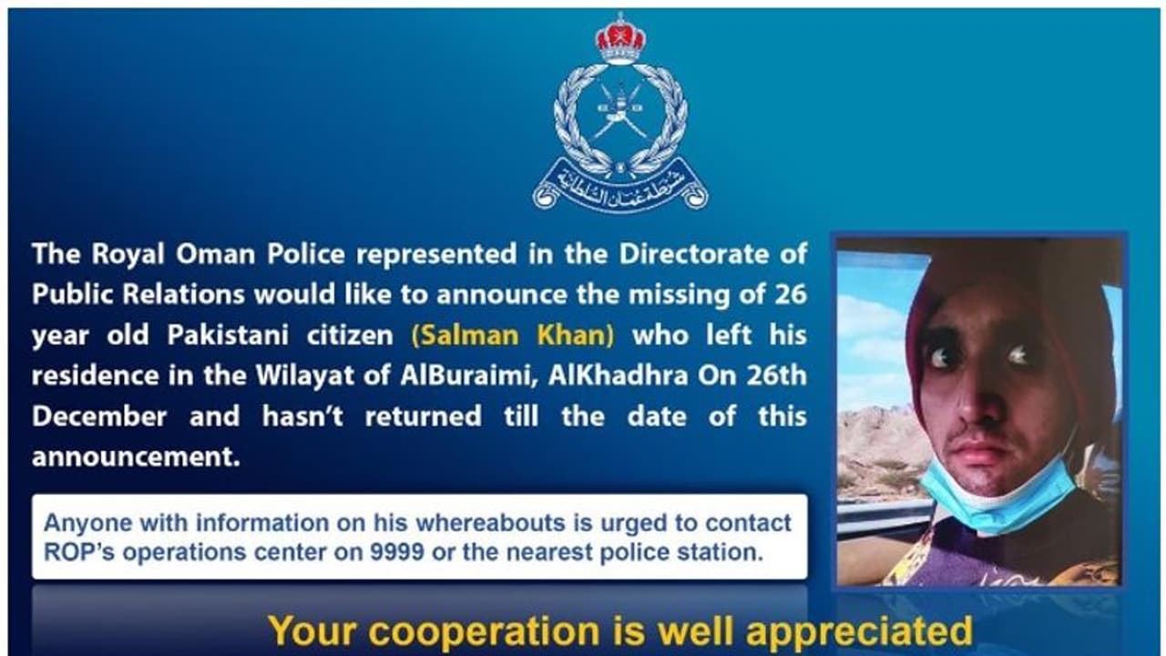 ഇയാളെക്കുറിച്ച് എന്തെങ്കിലും വിവരം ലഭിക്കുന്നവര് അടുത്തുള്ള പൊലീസ് സ്റ്റേഷനിലോ 9999 എന്ന നമ്പറിലോ ബന്ധപ്പെടണമെന്ന് റോയല് ഒമാന് പൊലീസ് ആവശ്യപ്പെട്ടു.