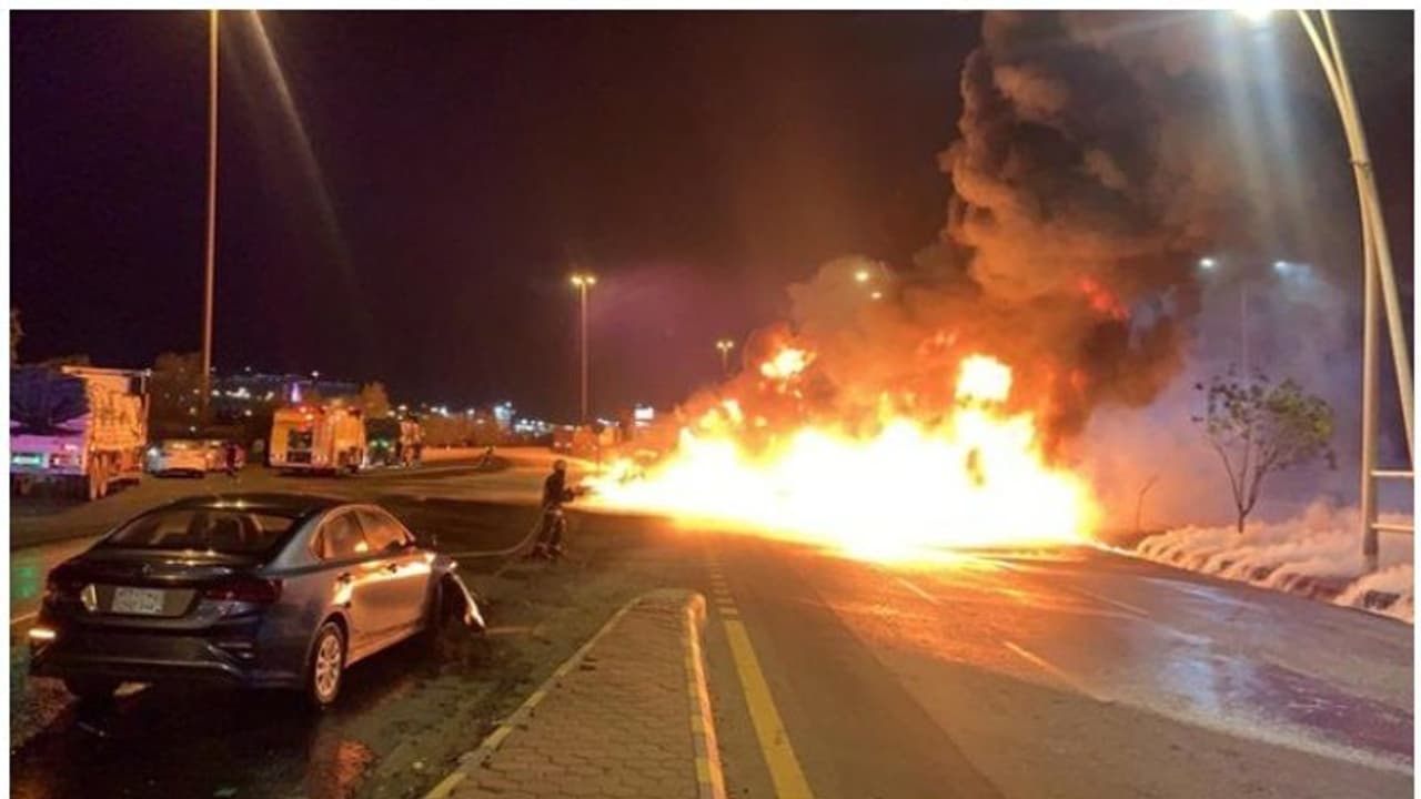തീപിടിത്തത്തിന്റെ വീഡിയോകള് സോഷ്യല് മീഡിയയില് വൈറലാണ്. വാഹനാപകടം നടന്നതിന് പിറകില് ഉണ്ടായിരുന്ന ടാങ്കറിനാണ് തീപിടിച്ചത്. കത്തിനശിച്ച വാഹനങ്ങള് നീക്കം ചെയ്ത് റോഡ് സുരക്ഷ വിഭാഗം ഗതാഗതം സാധാരണ നിലയിലാക്കി.