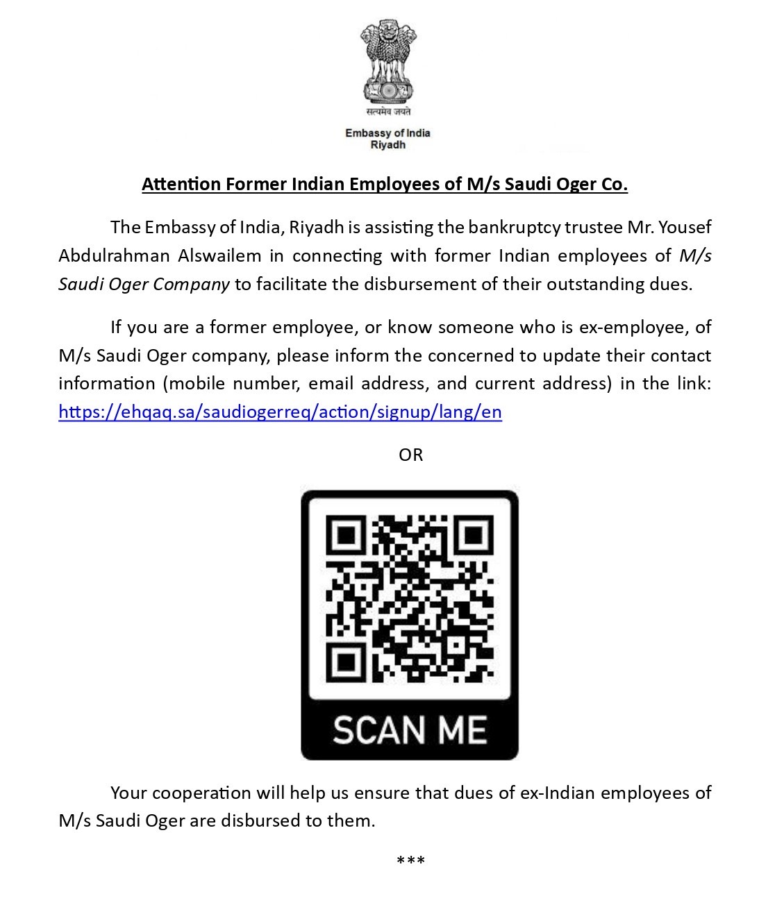 സൗദി ഓജർ കമ്പനിയിൽ ജോലി ചെയ്തിരുന്ന ഇന്ത്യക്കാർ തങ്ങൾക്ക് ലഭിക്കാൻ ബാക്കിയുള്ള അനുകൂല്യങ്ങൾക്കായി പ്രത്യേകം രജിസ്റ്റർ ചെയ്യണമെന്ന് റിയാദ് ഇന്ത്യൻ എംബസി.