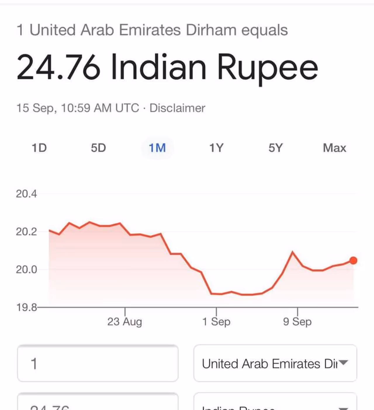 ദുബൈ: ബുധനാഴ്ച ഉച്ചയ്ക്ക് ശേഷം വെറുതെയിരുന്ന് ഗൂഗിളില് വിനിമയ നിരക്ക് നോക്കിയ യുഎഇയിലെ പ്രവാസികള് ഞെട്ടി. യുഎഇ ദിര്ഹത്തിന് 24 ഇന്ത്യന് രൂപയിലും മുകളില് മൂല്യം. തോന്നിയതായിരിക്കുമെന്നും എന്തെങ്കിലും പ്രശ്നമായിരിക്കുമെന്നും കരുതി വീണ്ടും വീണ്ടും നോക്കിയപ്പോഴും സംഗതി 24ന് മുകളില് തന്നെ. ഇന്നലെ വരെ 20 രൂപയുടെ അടുത്തൊക്കെ നിന്നിരുന്ന എക്സ്ചേഞ്ച് റേറ്റിന് പെട്ടെന്ന് എന്ത് പറ്റി എന്നറിയാതെ അമ്പരന്ന് പലരും സുഹൃത്തുക്കളെ വിവരമറിയിച്ചു. ഗുഗിളില് നോക്കിയവര്ക്കെല്ലാം കിട്ടിയത് 24ന് മുകളില് തന്നെ.