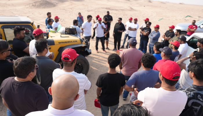 ടയർ പ്രഷർ കുറയ്ക്കൽ, വോക്കി-ടോക്കി പരിശോധന, 4H/4L മോഡിലേക്ക് മാറ്റൽ തുടങ്ങിയ ഒരുക്കങ്ങൾ പൂർത്തിയാക്കി 1:15ന് 25-ഓളം 4x4 വാഹനങ്ങൾ ഒരു കോൺവോയി രൂപത്തിലായി മണൽ കുന്നുകൾക്കിടയിലൂടെ പ്രവേശിച്ചു. യാത്രയ്ക്കിടെ പല വാഹനങ്ങളും മണലിൽ കുടുങ്ങിയെങ്കിലും, എല്ലാ അംഗങ്ങളും ഒരുമിച്ചുള്ള ശ്രമത്താൽ വണ്ടികൾ സുരക്ഷിതമായി പുറത്തെടുത്തു. “ഒന്നുമിച്ചു നിൽക്കുക” എന്നതാണ് ഗ്രൂപ്പിന്റെ ശക്തിയെന്ന് അംഗങ്ങൾ പറഞ്ഞു. മണൽമലകൾ കയറി ഇറങ്ങുന്നതും ചെറിയ പീക്കുകൾ കീഴടക്കുന്നതും സസ്പെൻസ് നിറഞ്ഞ നിമിഷങ്ങൾ ആയിരുന്നെന്ന് സംഘാഗങ്ങൾ പറഞ്ഞു. പരസ്പരം പ്രോത്സാഹിപ്പിച്ചും മാർഗ്ഗനിർദ്ദേശങ്ങൾ നൽകിയും എല്ലാവരും ഒരുമിച്ച് പ്രവർത്തിച്ചു.