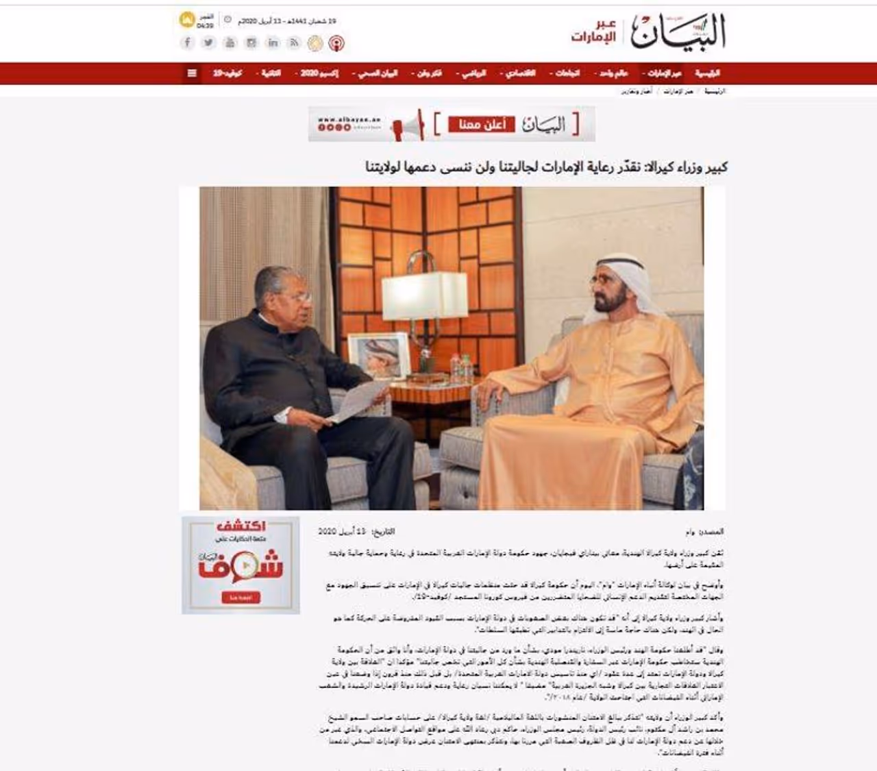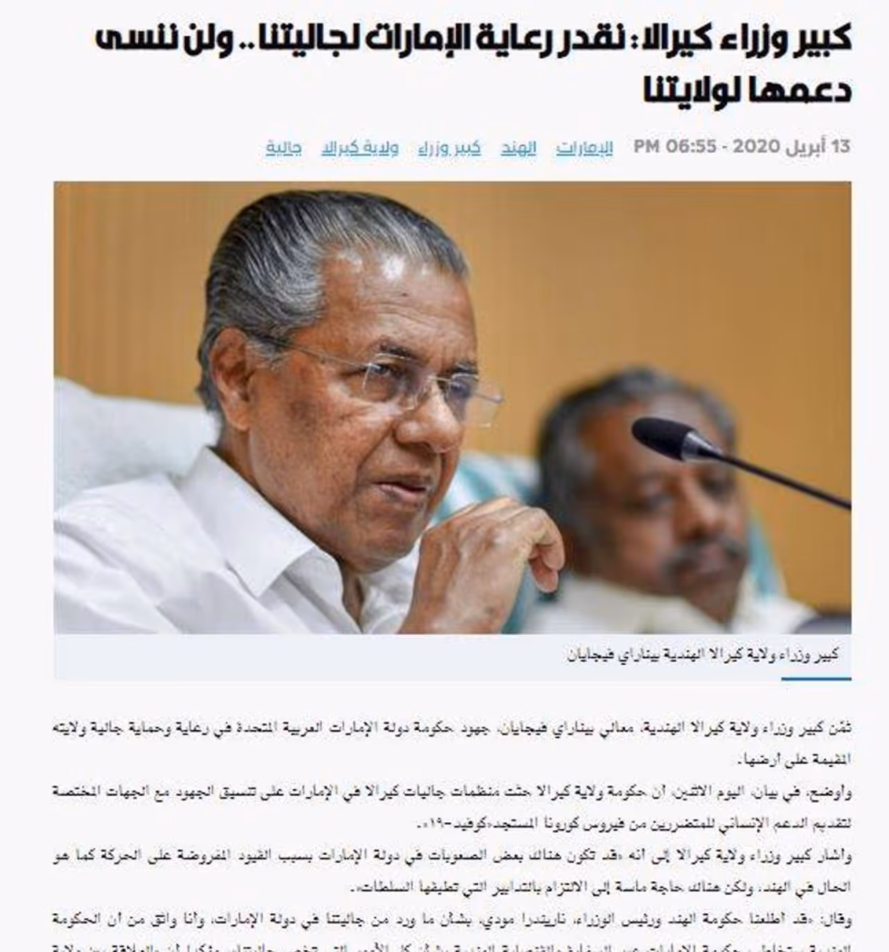 യുഎഇ അധികൃതരുമായി സഹകരിച്ച് പ്രവാസികള്ക്ക് സഹായമെത്തിക്കാന് സന്നദ്ധ സംഘടനകളോട് മുഖ്യമന്ത്രി ആവശ്യപ്പെട്ട വിവരവും അറബ് മാധ്യമങ്ങളിലടക്കം വാര്ത്തയായി. കേരളവും യുഎഇയും തമ്മില് പതിറ്റാണ്ടുകള് മുമ്പ് മുതലുള്ള ബന്ധവും കേരളത്തിലെ പ്രളയ സമയത്ത് യുഎഇ ഭരണാധികാരികള് നല്കിയ കരുതലും റിപ്പോര്ട്ടുകളിലുണ്ട്.