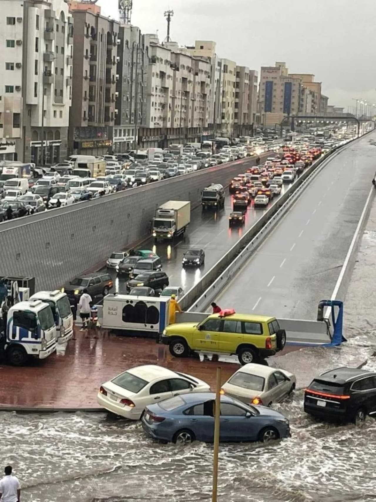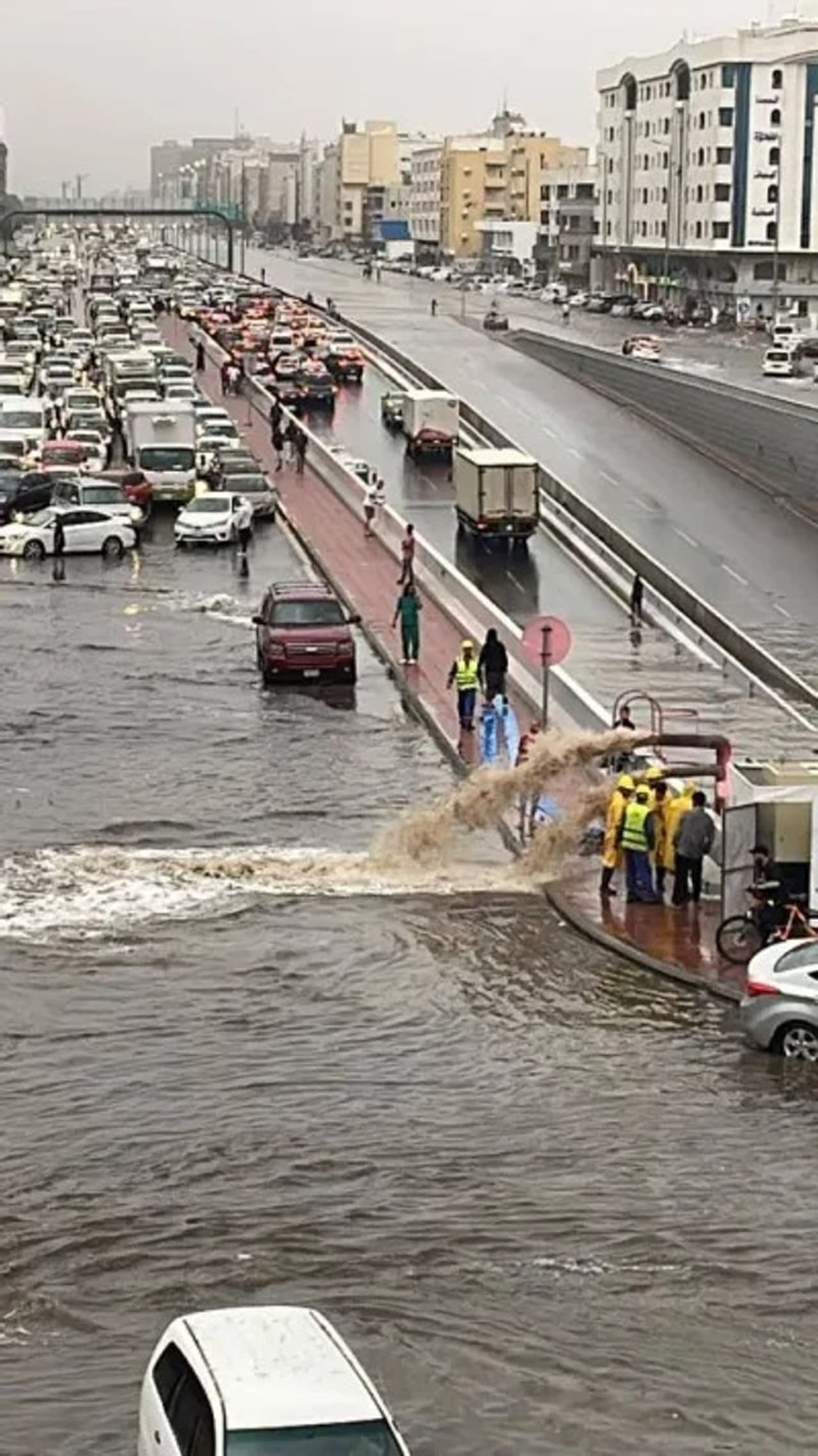 യാത്രക്കാര് പുതിയ സമയക്രമമറിയാന് അതത് വിമാന കമ്പനികളുമായി ബന്ധപ്പെടണമെന്ന് ജിദ്ദ കിംഗ് അബ്ദുല് അസീസ് എയര്പോര്ട്ട് അതോറിറ്റി അറിയിച്ചു. അതേസമയം റോഡില് കുടുങ്ങിക്കിടക്കുന്നവരെ രക്ഷപ്പെടുത്താന് ചെറിയ ബോട്ടുകളുമായി സിവില് ഡിഫന്സ് ഉദ്യോഗസ്ഥര് രംഗത്തുണ്ട്. പെട്ടെന്ന് റോഡുകളില് വെള്ളക്കെട്ട് രൂപപ്പെട്ടത് കാരണം നിരവധി വാഹനങ്ങള് റോഡില് കുടുങ്ങിക്കിടക്കുകയാണ്.
