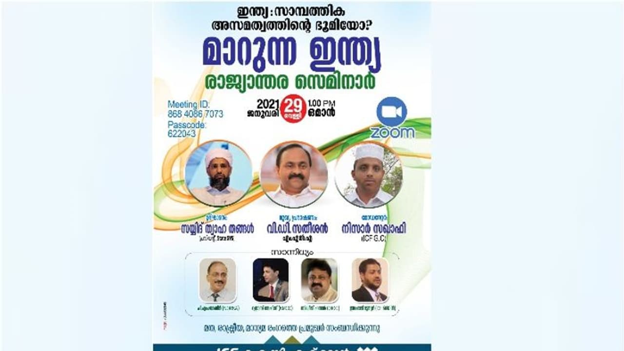 'ഇന്ത്യ: സാമ്പത്തിക അസമത്വത്തിന്റെ ഭൂമിയോ?' എന്ന വിഷയത്തില് ഐ സി എഫ് ഒമാന് നാഷനല് കമ്മിറ്റി ഓണ്ലൈനായി സംഘടിപ്പിക്കുന്ന സെമിനാര് വെള്ളിയാഴ്ച ഉച്ചക്ക് ഒരു മണിക്ക് എസ്വൈഎസ് സംസ്ഥാന പ്രസിഡന്റ് സയ്യിദ് ത്വാഹ തങ്ങള് ഉദ്ഘാടനം ചെയ്യും. വി ഡി സതീശന് എം എല് എ മുഖ്യ പ്രഭാഷണം നടത്തും. പ്രവാസി ക്ഷേമനിധി ബോര്ഡ് അംഗം പി എം ജാബിര്, ഐ സി എഫ് ഗള്ഫ് കൗണ്സില് സെക്രട്ടറി നിസാര് സഖാഫി, കെ എം സി സി കേന്ദ്ര കമ്മിറ്റി പ്രസിഡന്റ് റഈസ് അഹ്മദ്, ഒ ഐ സി സി ഒമാന് പ്രസിഡന്റ് സിദ്ദീഖ് ഹസന്, ഐ സി എഫ് ഒമാന് എജ്യുക്കേഷന് സെക്രട്ടറി ഇസഹാഖ് മട്ടന്നൂര് പ്രഭാഷണം നടത്തും.