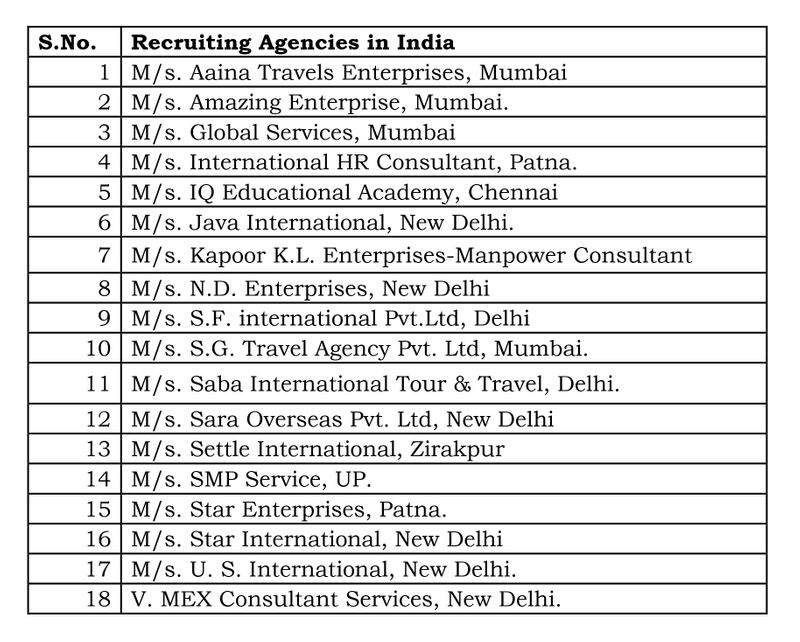 പട്ടികയിലുള്ള ഇന്ത്യന് റിക്രൂട്ടിങ് ഏജന്സികള് ഇവയാണ്...