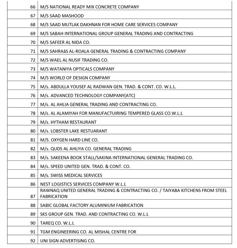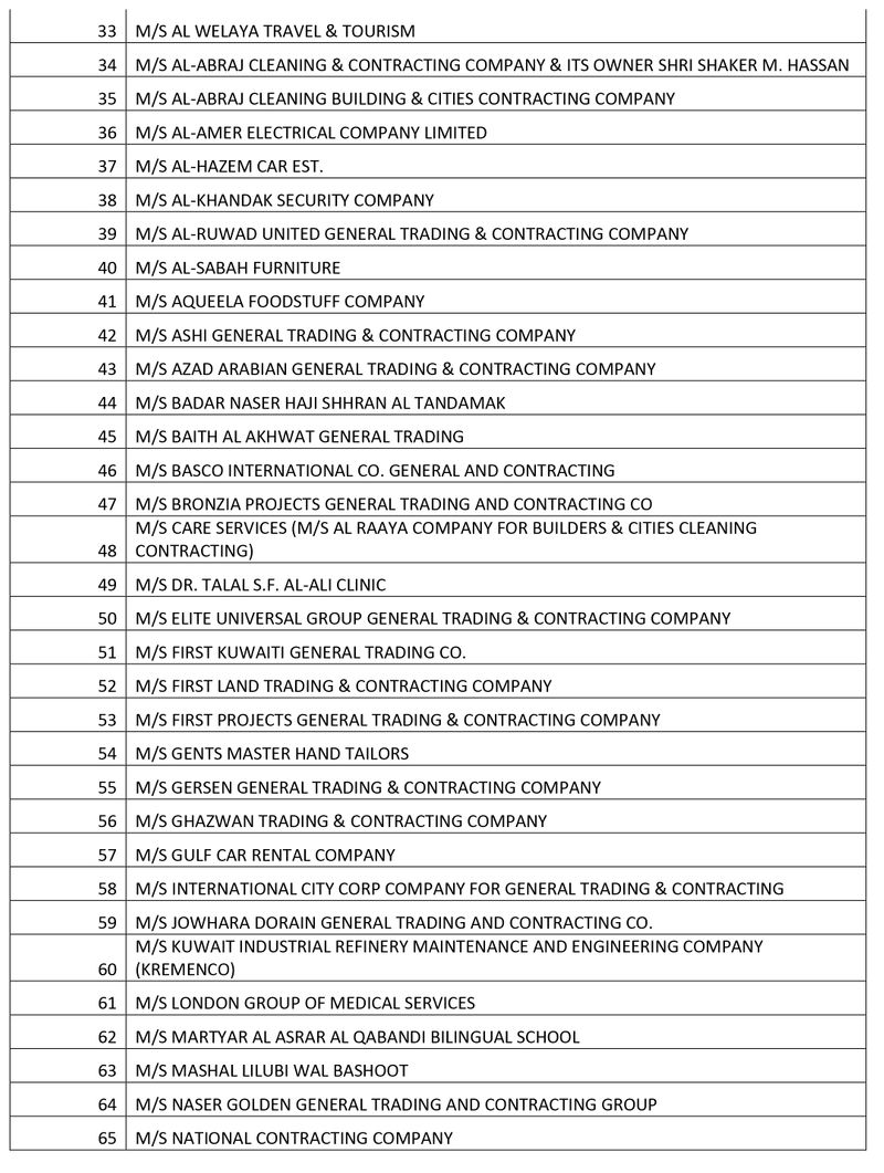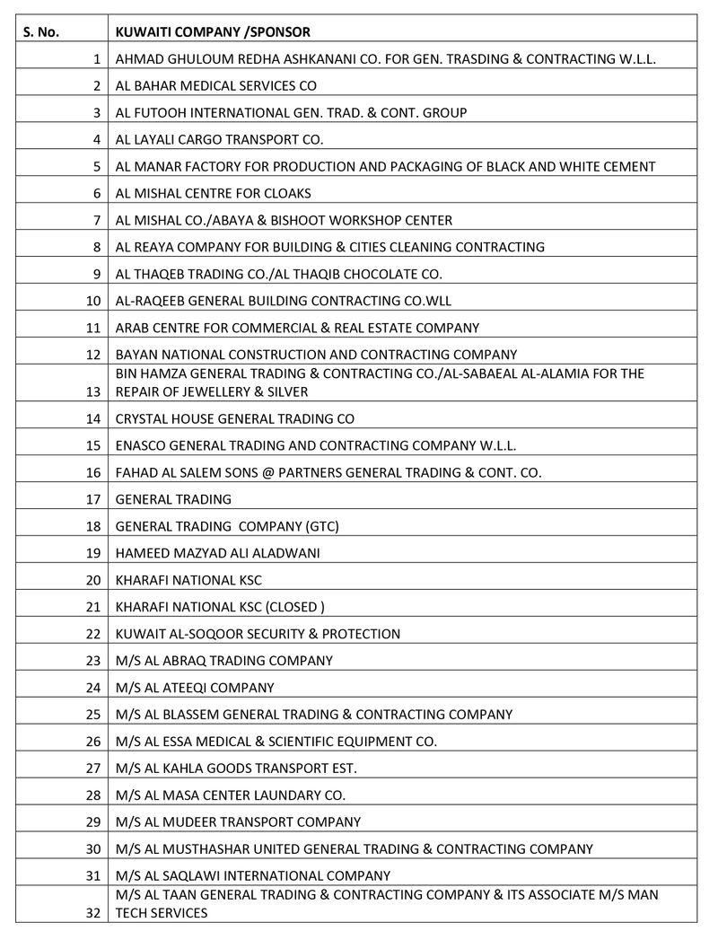ഡൽഹി, മുബൈ, ചെന്നൈ, പട്ന, ലഖ്നൗ എന്നിവിടങ്ങളിൽ നിന്നുള്ള ഏജൻസികളും, ജനറൽ ട്രേഡിങ് കമ്പനി മുതൽ ഫർണ്ണീച്ചർ ഷോപ്പ് വരെയുള്ള കുവൈത്തി കമ്പനികളെയുമാണ് കരിമ്പട്ടികയിൽ പെടുത്തിയിരിക്കുന്നത്.
