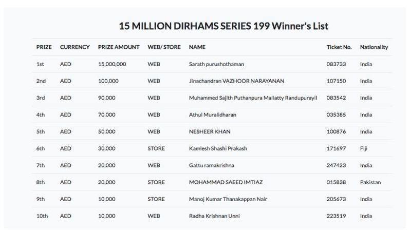 എട്ട് ഇന്ത്യക്കാര്ക്കൊപ്പം ഒരു പാകിസ്ഥാന് പൗരനും ഫിജിയില് നിന്നുള്ള ഒരാളുമാണ് ആദ്യ 10 വിജയികളുടെ പട്ടികയില് ഇടംപിടിച്ചത്. ഇന്ത്യക്കാരനായ ജിനചന്ദ്രന് വാഴൂര് നാരായണന് ഒരു ലക്ഷം ദിര്ഹത്തിന്റെ രണ്ടാം സമ്മാനം ലഭിച്ചു.