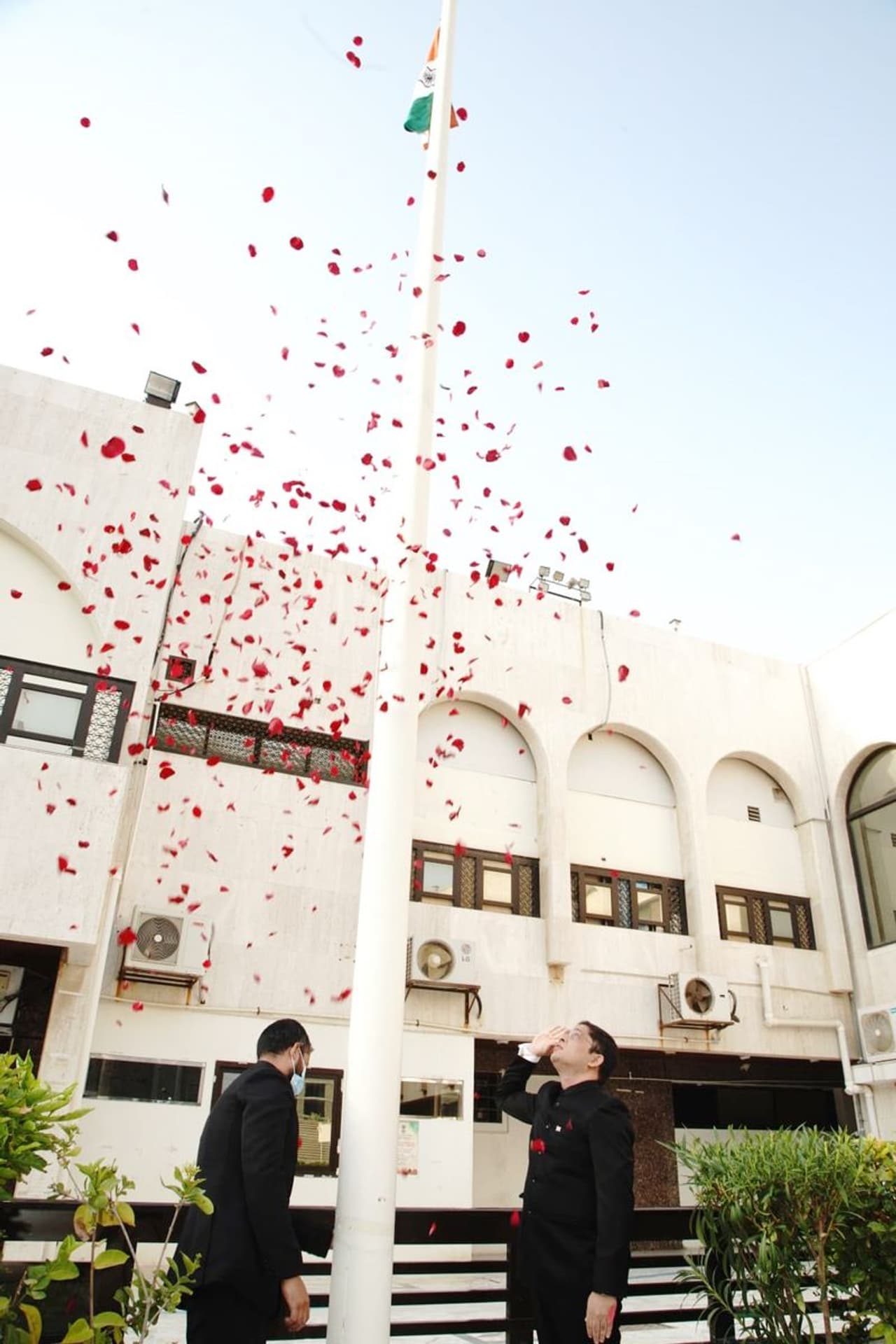 എംബസിയിൽ അംബാസഡർ ഡോ. ഔസാഫ് സഈദ് പതാക ഉയർത്തിയതോടെ ആഘോഷത്തിന് തുടക്കമായി. ജിദ്ദ ഇന്ത്യൻ കോൺസുലേറ്റിൽ രാവിലെ കോണ്സുല് ജനറല് മുഹമ്മദ് ഷാഹിദ് ആലം ദേശീയ പതാക ഉയര്ത്തി.