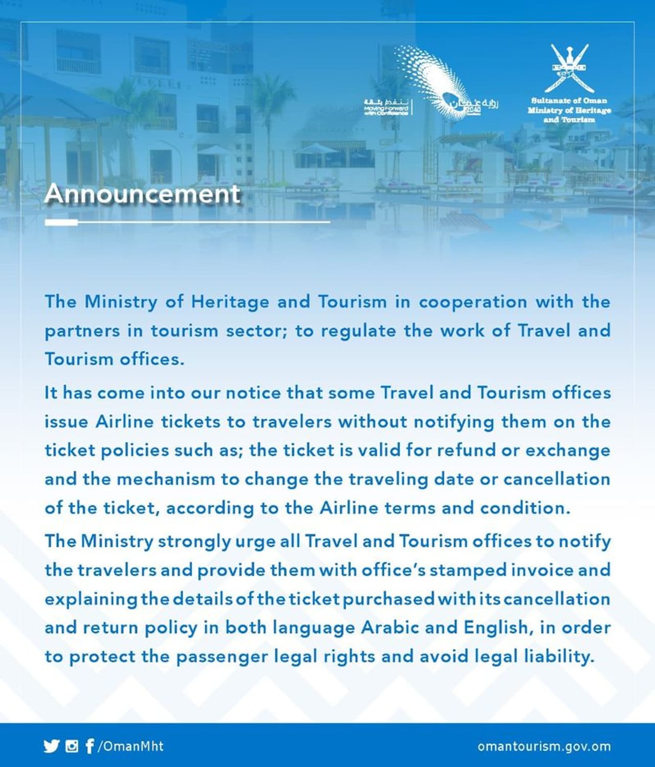 യാത്രക്കാരുടെ നിയമപരമായ അവകാശങ്ങള് സംരക്ഷിക്കുന്നതിനും കമ്പനിക്ക് നിയമപരമായ ഉത്തരവാദിത്വം ഒഴിവാക്കുന്നതിനുമാണ് ഈ നടപടിയെന്ന് പ്രസ്താവനയില് പറയുന്നു. ടിക്കറ്റ് റദ്ദാക്കല്, പണം തിരികെ നല്കുന്ന കരാറില് വാങ്ങിയ ടിക്കറ്റ് എന്നിവയുടെ വിശദീകരണം യാത്രക്കാരെ അറിയിക്കുന്നതിനും അവരുടെ അവകാശങ്ങള് സംരക്ഷിക്കുന്നതിനും നിയമപരമായ ബാധ്യതകള് ഒഴിവാക്കുന്നതിനും അറബിക്, ഇംഗ്ലീഷ് എന്നീ രണ്ട് ഭാഷകളില് ഉള്ള ഇന്വോയ്സാണ് വേണ്ടതെന്നും ഒമാന് ന്യൂസ് ഏജന്സിയുടെ അറിയിപ്പില് പറയുന്നു.