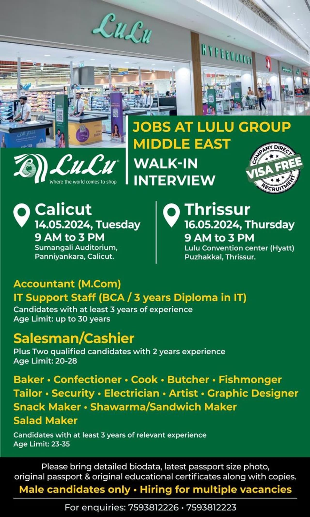 അക്കൗണ്ടൻറ്, ഐടി സപ്പോർട്ട് സ്റ്റാഫ്, സെയിൽസ്മാൻ, കാഷ്യർ, കുക്ക്, ബേക്കർ, ബുച്ചർ, ഫിഷ്മോഗർ, ടെയ്ലർ, സെക്യൂരിറ്റി, ഇലക്ട്രീഷ്യൻ, ആർട്ടിസ്റ്റ്, ഗ്രാഫിക്സ് ഡിസൈനർ, സ്നാക് മേക്കർ, സാൻഡ്വിച്ച് - ഷവർമ്മ - സലാഡ് മേക്കർ എന്നീ ഒഴിവുകളിലേക്കാണ് ഇന്റർവ്യൂ.