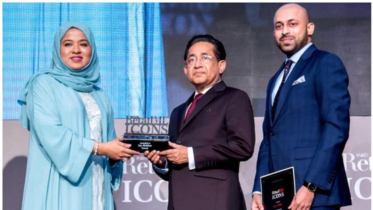 (ചിത്രം: ജോയ് ആലുക്കാസ് ഗ്രൂപ്പ് ചെയര്മാനായ ജോയ് ആലുക്കാസിന് മിന (MENA-Middle East & North Africa) മേഖലയിലെ റീട്ടെയില് ബിസിനസ് രംഗത്തെ പ്രവര്ത്തന മികവിനുള്ള അംഗീകാരമായി പ്രമുഖ പുരസ്കാരമായ റീട്ടെയില്മീ (RetailME) ഐകോണ്സ് അവാര്ഡ് സമ്മാനിക്കുന്നു. ദുബൈ ഡിപാര്ട്മെന്റ് ഓഫ് ടൂറിസം ആന്റ് കോമേഴ്സ് മാര്ക്കറ്റിങ്ങ്-അലൈന്സ് ആന്റ് പാര്ട്ണര്ഷിപ്പ് സിഇഒ ലൈല മുഹമ്മദ് സുഹൈലില് നിന്നും ജോയ് ആലുക്കാസ് അവാര്ഡ് സ്വീകരിക്കുന്നു. ജോയ് ആലുക്കാസ് ജ്വല്ലറി ഇന്റര്നാഷനല് ഓപറേഷന്സ് മാനേജിങ്ങ് ഡയറക്ടര് ജോണ് പോള് സമീപം.)