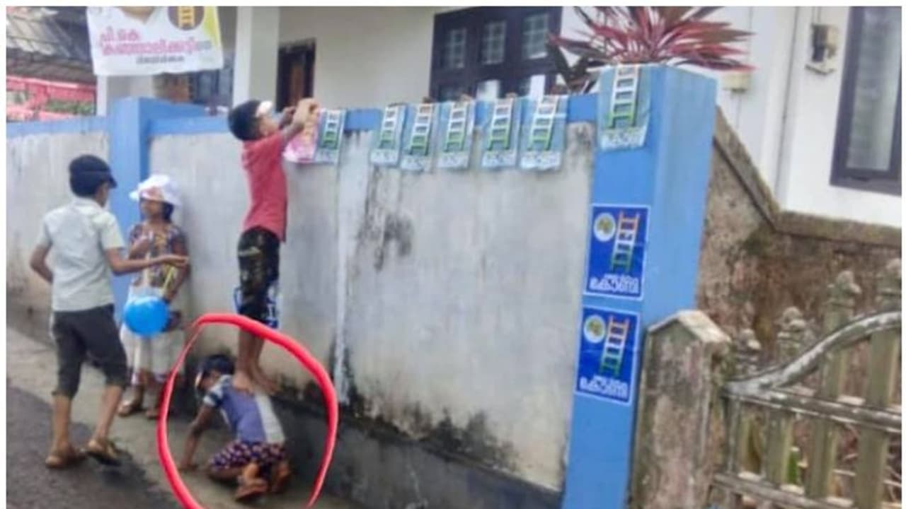 മതിലില് പോസ്റ്റര് ഒട്ടിക്കുന്ന കുട്ടികളുടെ ചിത്രം കഴിഞ്ഞ ദിവസം കുഞ്ഞാലിക്കുട്ടി തന്നെയാണ് ഫേസ്ബുക്കിലൂടെ പങ്കുവെച്ചത്. മതിലിന്റെ ഏറ്റവും മുകളില് പോസ്റ്ററൊട്ടിക്കാന് ഒരാളുടെ പുറത്ത് കയറിനില്ക്കുന്ന ചിത്രമായിരുന്നു ഇത്.