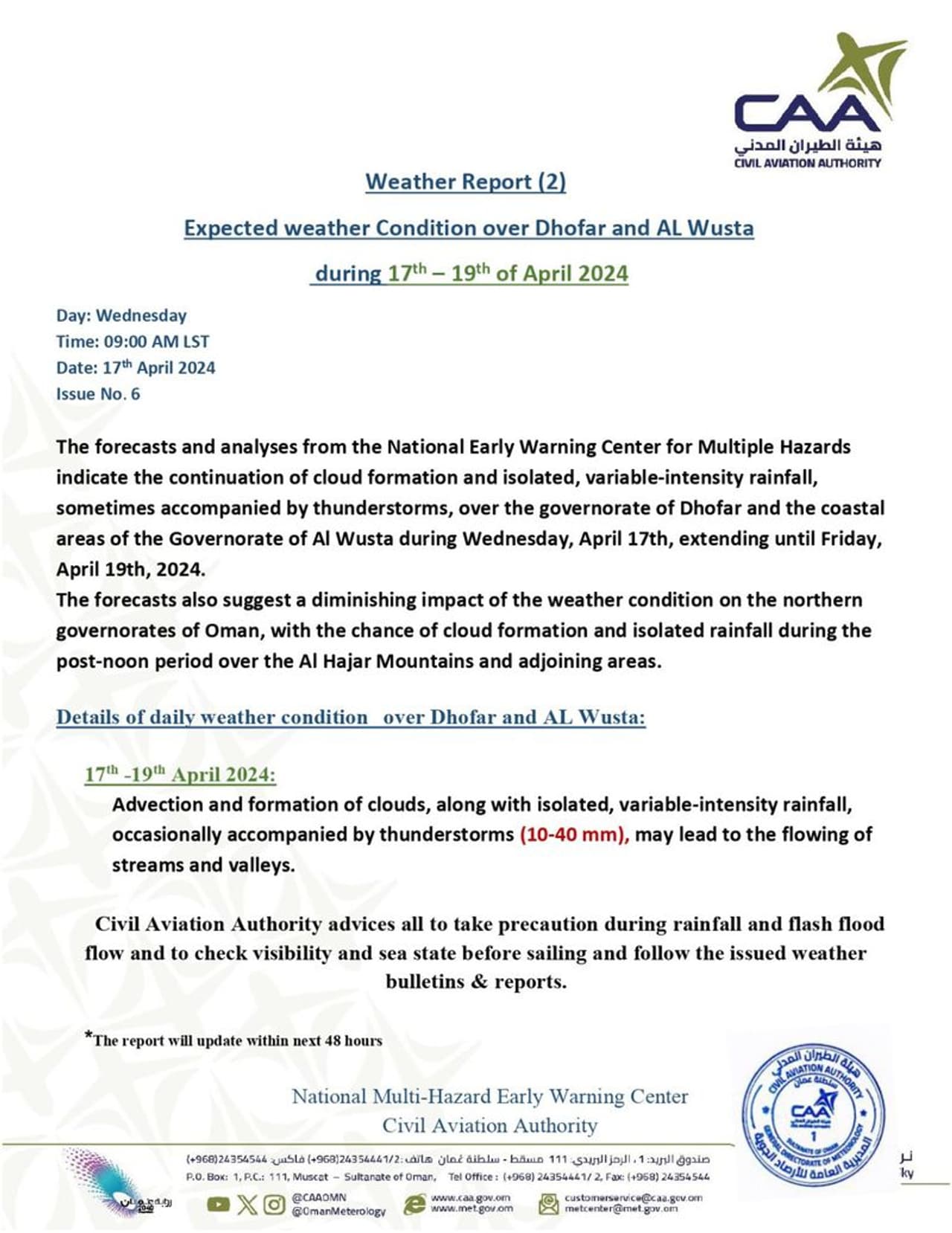 അതേസമയം ഒമാനിൽ പെയ്ത കനത്ത മഴയെ തുടർന്ന് വിവിധ ഗവർണറേറ്റുകളിൽ ഇതുവരെ പ്രവർത്തനക്ഷമമാക്കിയ 18 ദുരിതാശ്വാസ, അഭയകേന്ദ്രങ്ങളിൽ 1,333 പേരെ പ്രവേശിപ്പിച്ചതായി നാഷണൽ സെന്റര് ഫോർ എമർജൻസി മാനേജ്മെന്റ് അറിയിച്ചു. അൽ-ബുറൈമിയിൽ നിന്ന് സോഹാറിലേക്കുള്ള വാദി അൽ ജിസി റോഡും, അൽ ജബൽ അൽ അഖ്ദർ റോഡും സുരക്ഷാ കണക്കിലെടുത്ത് അടച്ചിട്ടതായി അറിയിപ്പിൽ പറയുന്നു.