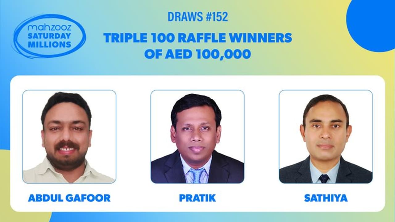 മഹ്സൂസ് സാറ്റര്ഡേ മില്യൺസ് 152-ാമത് ആഴ്ച്ച നറുക്കെടുപ്പിൽ ഗ്യാരണ്ടീഡ് റാഫ്ള് വിജയികളായത് മൂന്ന് ഇന്ത്യക്കാര്. മൂന്നു പേര്ക്കും ഒരു ലക്ഷം ദിര്ഹം വീതം സമ്മാനം ലഭിച്ചു. ഷാര്ജയിൽ താമസിക്കുന്ന അബ്ദുള് ഗഫൂര്, അബുദാബിയിൽ നിന്നുള്ള പ്രതീക്, ദുബായിൽ നിന്നുള്ള സത്യ എന്നിവരാണ് വിജയികള്.