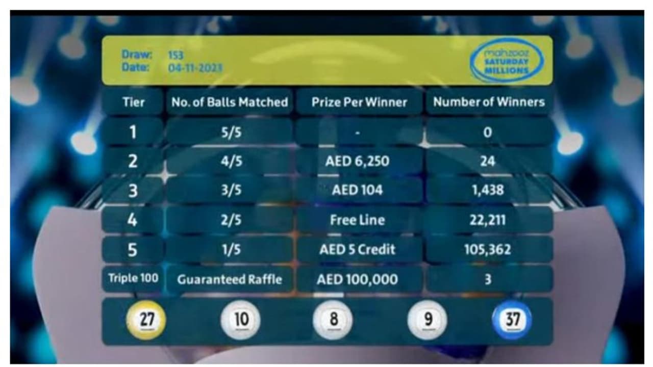 8,9,10,27,37എന്നിവയായിരുന്നു നറുക്കെടുത്ത സംഖ്യകള്. മൂന്ന് റാഫിള് ഡ്രോ വിജയികള് ആകെ 300,000 ദിര്ഹം നേടി.