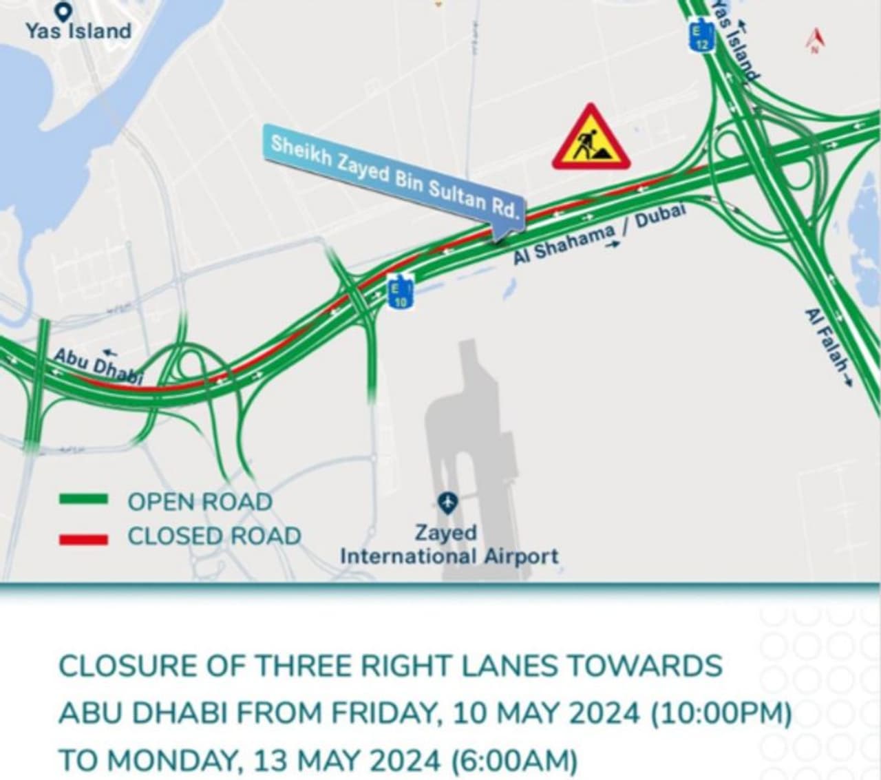 ബുധനാഴ്ച എക്സ് പ്ലാറ്റ്ഫോമിലൂടെയാണ് അധികൃതര് ഇക്കാര്യം അറിയിച്ചത്. മെയ് 10 വെള്ളിയാഴ്ച രാത്രി 10 മണി മുതല് മെയ് 13 തിങ്കളാഴ്ച രാവിലെ ആറ് മണി വരെയാണ് റോഡ് അടച്ചിടുന്നത്. അബുദാബിയിലേക്കുള്ള മൂന്ന് പാതകൾ അടച്ചിടും. താഴെ കൊടുത്തിരിക്കുന്ന മാപ്പിൽ ചുവപ്പ് നിറത്തിൽ ഹൈലൈറ്റ് ചെയ്തിരിക്കുന്ന പാതകളാണ് അടയ്ക്കുക. അതേസമയം പച്ച നിറത്തിലുള്ളവ ബാധിക്കപ്പെടാതെ തുടരും.