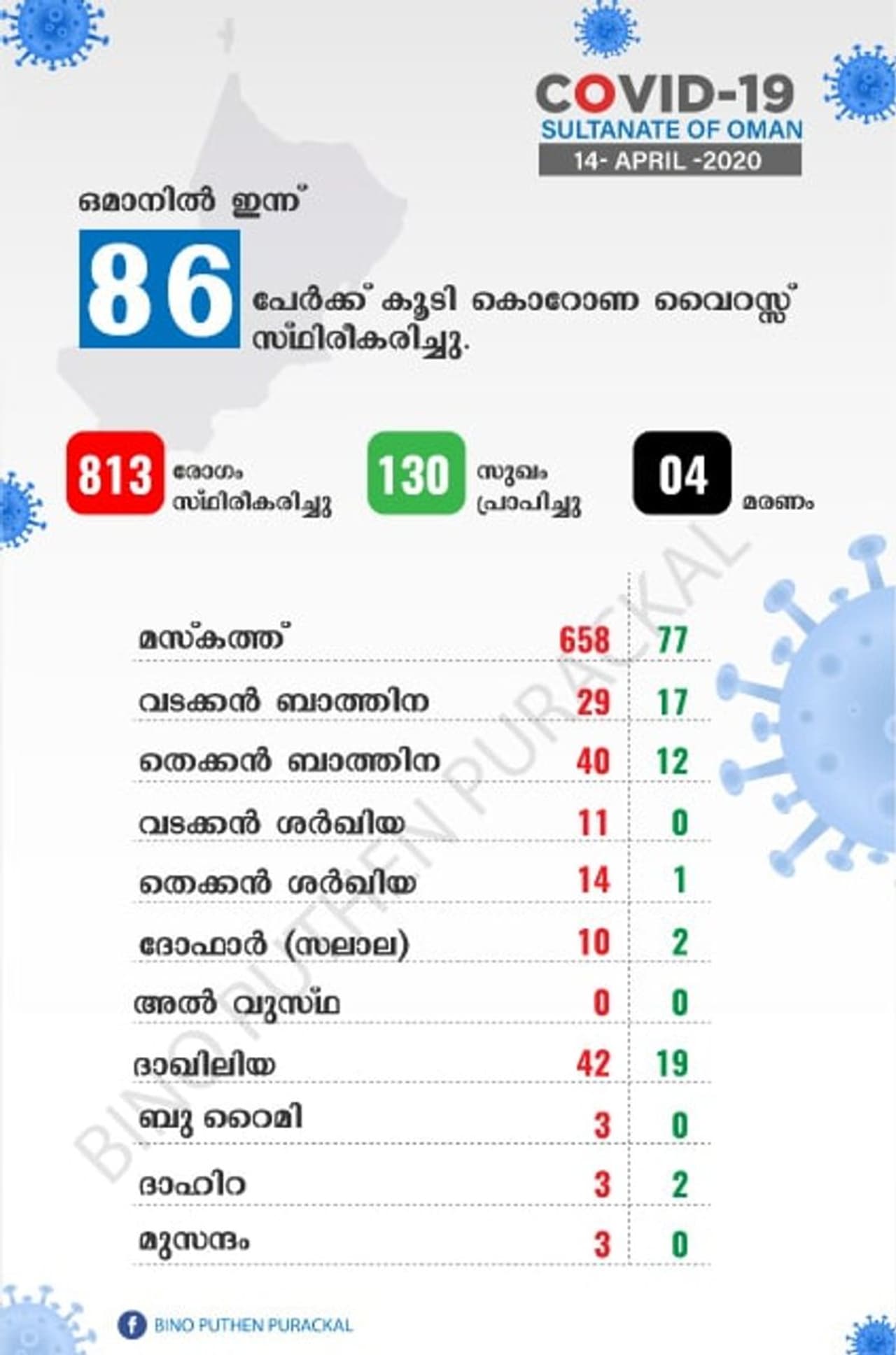 ഇന്ന് രാജ്യത്ത് 86 പുതിയ കൊറോണ വൈറസ് കേസുകള് റിപ്പോര്ട്ട് ചെയ്യപ്പെട്ടിട്ടുണ്ട്, ഇതോടെ ഒമാനില് രോഗ ബാധിതരുടെ എണ്ണം 813 ആയി. 130 പേര് രോഗ വിമുക്തരായതായും അധികൃതര് വ്യക്തമാക്കി.