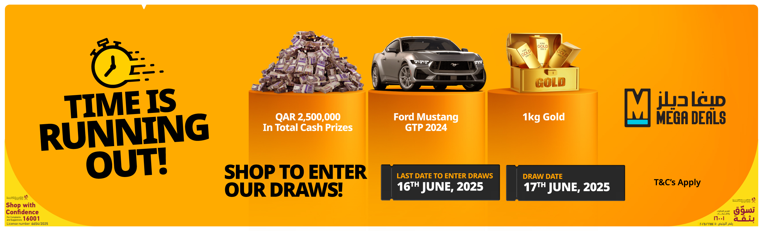 ജൂൺ 17-ന് നടക്കുന്ന മെഗാ ഡീൽസ് ഡ്രോയിൽ മൊത്തം 2,500,000 ഖത്തർ റിയാലാണ് ക്യാഷ് പ്രൈസുകൾ. ഒരു ഭാഗ്യശാലിക്ക് ഗ്രാൻഡ് പ്രൈസായ 1,000,000 ഖത്തർ റിയാൽ സ്വന്തമാക്കാം. കൂടാതെ 500,000, 100,000 എന്നിങ്ങനെയാണ് അടുത്ത സമ്മാനങ്ങൾ. 100 വിജയികൾക്ക് 5,000 ഖത്തർ റിയാൽ, 400 പേർക്ക് 1,000 ഖത്തർ റിയാൽ എന്നിങ്ങനെയാണ് മറ്റു ക്യാഷ് പ്രൈസുകൾ. ആകർഷകമായ ഈ സമ്മാനങ്ങൾക്ക് പുറമെ 1 കിലോഗ്രാം സ്വർണ്ണം, മസ്താങ് ജിടിപി 2024 എന്നിവയും ഭാഗ്യശാലികളെ കാത്തിരിക്കുന്നു.