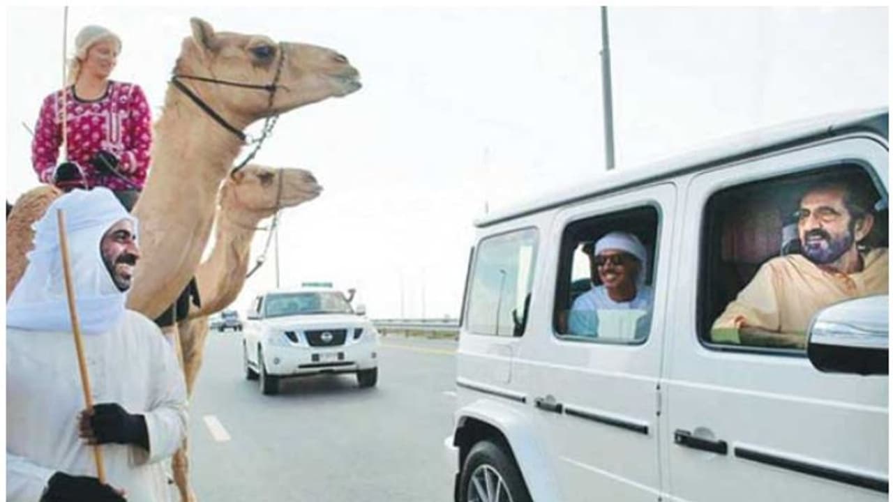 യുഎഇ, ചെക്ക് റിപ്പബ്ലിക്, ഫ്രാൻസ്, ജർമ്മനി, റഷ്യ, ദക്ഷിണാഫ്രിക്ക, സ്പെയിൻ എന്നിവിടങ്ങളിൽ നിന്നുള്ള എട്ട് സ്ത്രീകളും മൂന്ന് പുരുഷന്മാരും അടങ്ങിയതായിരുന്നു ഒട്ടക ട്രെക്കിങ് സംഘം. നവംബർ 29 ന് അബുദാബിയിലെ പടിഞ്ഞാറൻ മേഖലയില് നിന്നാണ് ഇവര് യാത്ര തുടങ്ങിയത്. ദുബൈ ഗ്ലോബൽ വില്ലേജിനുള്ളിലെ ഹെറിറ്റേജ് വില്ലേജിലെ അവസാന ലക്ഷ്യസ്ഥാനത്തേക്കുള്ള യാത്രയില് അൽ മർമൂം പ്രദേശത്തുവെച്ചായിരുന്നു സംഘം ശൈഖ് മുഹമ്മദിനെ കണ്ടുമുട്ടിയത്. യാത്രയുടെ വിജയത്തിന് സംഘത്തെ ശൈഖ് മുഹമ്മദ് അഭിനന്ദിച്ചു. പിന്നിട്ട വഴികളെക്കുറിച്ച് സംഘം അദ്ദേഹത്തോട് വിശദീകരിച്ചു.