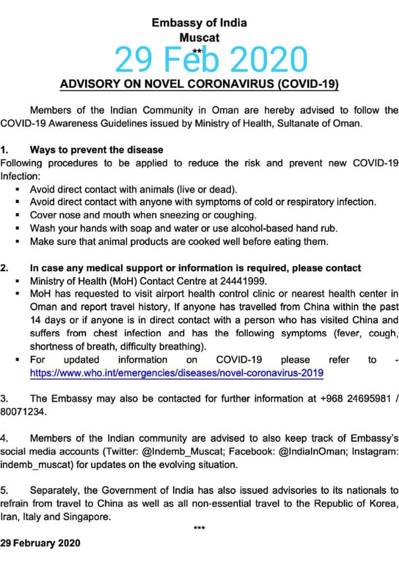കൊറോണ വൈറസ് വ്യാപനം തടയുന്നതിന്റെ ഭാഗമായി ഒമാനിലെ ഇന്ത്യക്കാർക്കായി എംബസി പ്രത്യേക നിര്ദേശങ്ങള് നല്കി. ഒമാനിൽ താമസിച്ചു വരുന്ന ഇന്ത്യക്കാർ കൊറോണ വൈറസിനെതിരെ കൂടുതൽ ജാഗ്രത പുലർത്തണമെന്നാണ് എംബസി ആവശ്യപ്പെട്ടിരിക്കുന്നത്.
