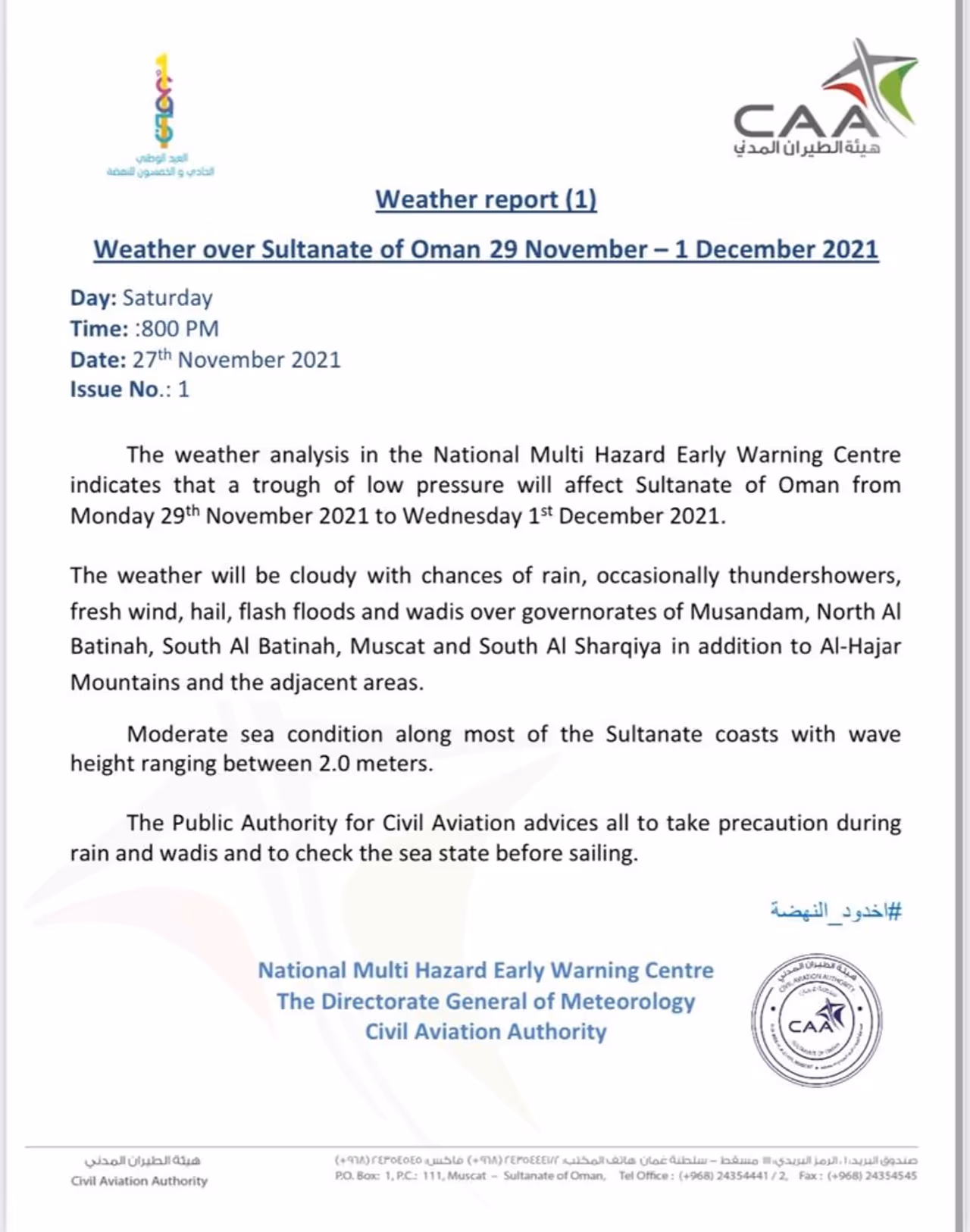 അന്തരീക്ഷം മേഘാവൃതമായിരിക്കും. രാജ്യത്ത് മഴയ്ക്കും സാധ്യതയുണ്ട്. ഇടക്കിടെ ഇടിയോട് കൂടിയ മഴയ്ക്കും കാറ്റിനും സാധ്യതയുണ്ട്. അല് ഹജാര് മലനിരകളിലും പരിസര പ്രദേശങ്ങളിലും മുസന്ദം, വടക്കന് അല് ബത്തിന, തെക്കന് അല് ബത്തിന, മസ്കറ്റ്, തെക്കന് അല് ശര്ഖിയ എന്നീ ഗവര്ണറേറ്റുകളിലെ വാദികളിലും വെള്ളക്കെട്ട് ഉണ്ടാകാനുള്ള സാധ്യതയും അധികൃതര് അറിയിച്ചു. കടല് ശാന്തമായിരിക്കുമെന്നും തിരമാലകള് 2.0 മീറ്റര് ഉയരത്തില് രൂപപ്പെടുമെന്നും അധികൃതര് കൂട്ടിച്ചേര്ത്തു. ജനങ്ങള് ജാഗ്രത പുലര്ത്തണമെന്ന് പബ്ലിക് അതോറിറ്റി ഫോര് സിവില് ഏവിയേഷന് അറിയിച്ചു.