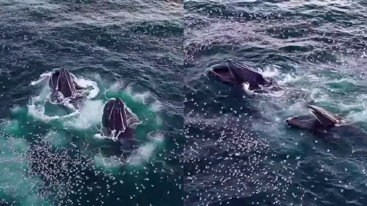 കൂറ്റൻ തിമിംഗലങ്ങളുടെ മനോഹര ദൃശ്യം പങ്കുവെച്ച് ഒമാൻ പരിസ്ഥിതി അതോറിറ്റി. കടൽപ്പക്ഷികളുടെ പശ്ചാത്തലത്തിൽ സമുദ്രോപരിതലത്തിലുള്ള ദൃശ്യം ഒമാന്റെ മസീറ ദ്വീപിന് അടുത്താണ്.