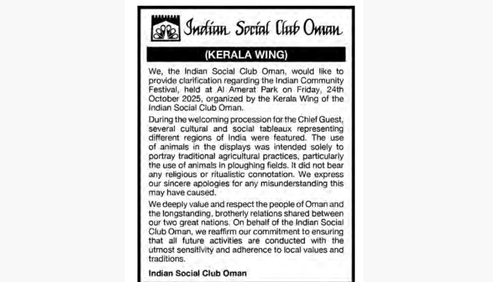 'ഒമാൻ ഡെയിലി ഒബ്സർവർ' ഉൾപ്പടെയുള്ള പത്രങ്ങളിലാണ് വിശദീകരണവും ഖേദപ്രകടനവുമായി ഒമാൻ ഇന്ത്യൻ സോഷ്യൽ ക്ലബിന്റെ പരസ്യം. മുഖ്യമന്ത്രിയെ സ്വീകരിക്കാൻ ഒരുക്കിയ ഘോഷയാത്രയിൽ വാദ്യങ്ങളും മേളങ്ങളും പ്രച്ഛന്ന വേഷങ്ങളും മൃഗകോലങ്ങളും ഉൾപ്പെടുത്തിയിരുന്നു. ഈ കോലങ്ങൾ വിവാദമായി. ഇത്തരം ബിംബങ്ങൾ തെറ്റായ സന്ദേശമാണെന്നും നിയന്ത്രിക്കണമെന്നും ഉള്ള രീതിയിൽ ഒമാനിൽ സാമൂഹിക മാധ്യമങ്ങളിൽ വലിയ വിമർശനവും ചർച്ചയും ആയി. പിന്നാലെയാണ് ഈ കോലം നിലമുഴുന്നതിന്റെ കാർഷിക പ്രതിരൂപമാണെന്നും മതപരമായ അർത്ഥമില്ലെന്നും വിശദീകരണം നൽകിയത്. തെറ്റിദ്ധാരണകളിൽ ഖേദവും പ്രകടിപ്പിച്ചു.