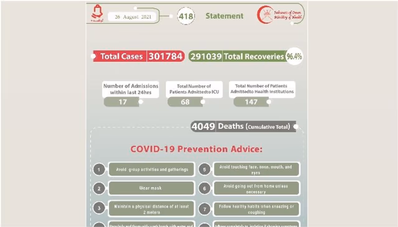 ഇതുവരെയുള്ള കണക്കുകള് പ്രകാരം രാജ്യത്ത് 3,01,784 പേര്ക്കാണ് കൊവിഡ് സ്ഥിരീകരിച്ചത്. ഇവരില് 2,91,039 പേര് ഇതിനോടകം രോഗമുക്തരായി. 96.4 ശതമാനമാണ് നിലവിലെ രോഗമുക്തി നിരക്ക്. ആകെ 4,049 പേര്ക്ക് ഒമാനില് കൊവിഡ് കാരണം ജീവന് നഷ്ടമായി. കഴിഞ്ഞ 24 മണിക്കൂറിനിടെ 17 പേരെ മാത്രമാണ് കൊവിഡ് ബാധിതരായി രാജ്യത്തെ വിവിധ ആശുപത്രികളില് പ്രവേശിപ്പിച്ചത്. ഇവര് ഉള്പ്പെടെ 147 പേര് ഇപ്പോള് ചികിത്സയിലുണ്ട്. ഇവരില് 68 പേര് തീവ്രപരിചരണ വിഭാഗത്തിലാണ്.