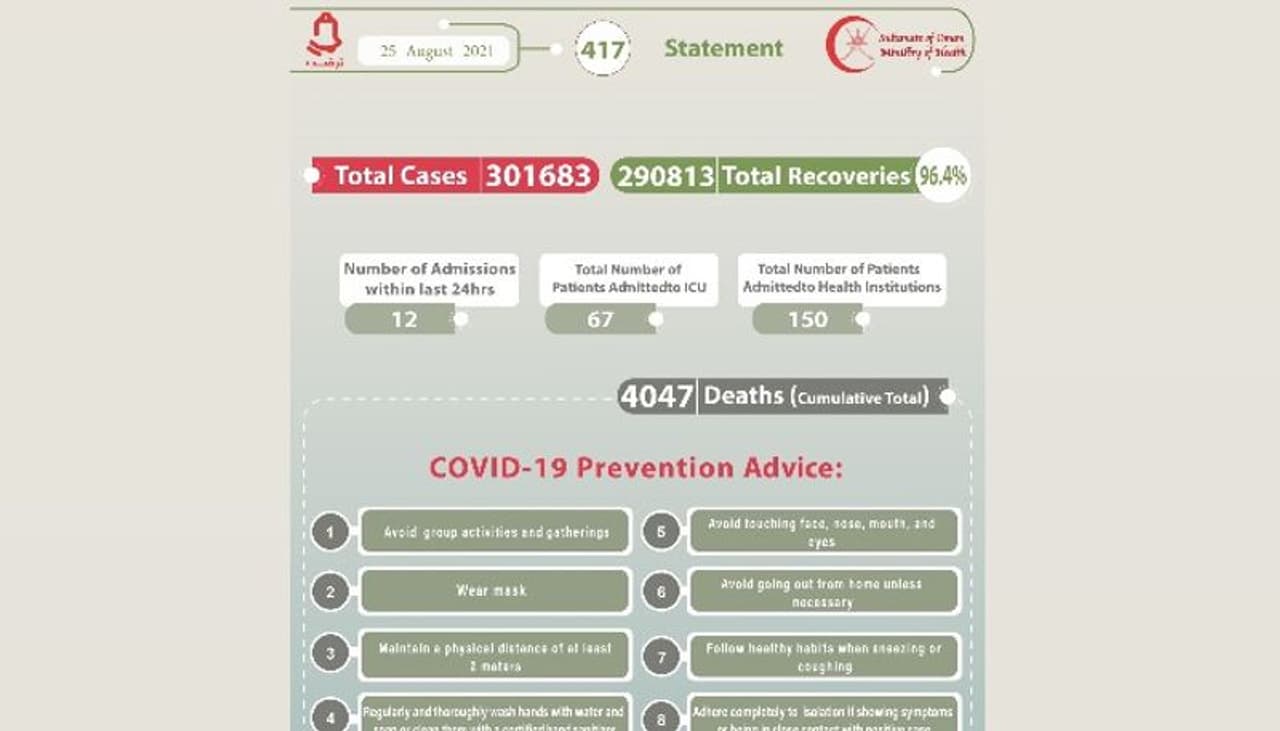 ഇതുവരെയുള്ള കണക്കുകള് പ്രകാരം രാജ്യത്ത് 3,01,683 പേര്ക്കാണ് കൊവിഡ് സ്ഥിരീകരിച്ചത്. ഇവരില് 2,90,813 പേര് ഇതിനോടകം രോഗമുക്തരായി. 96.4 ശതമാനമാണ് നിലവിലെ രോഗമുക്തി നിരക്ക്. ആകെ 4,047 പേര്ക്ക് ഒമാനില് കൊവിഡ് കാരണം ജീവന് നഷ്ടമായി. കഴിഞ്ഞ 24 മണിക്കൂറിനിടെ 12 പേരെ മാത്രമാണ് കൊവിഡ് ബാധിതരായി രാജ്യത്തെ വിവിധ ആശുപത്രികളില് പ്രവേശിപ്പിച്ചത്. ഇവര് ഉള്പ്പെടെ 150 പേര് ഇപ്പോള് ചികിത്സയിലുണ്ട്. ഇവരില് 67 പേര് തീവ്രപരിചരണ വിഭാഗത്തിലാണ്.