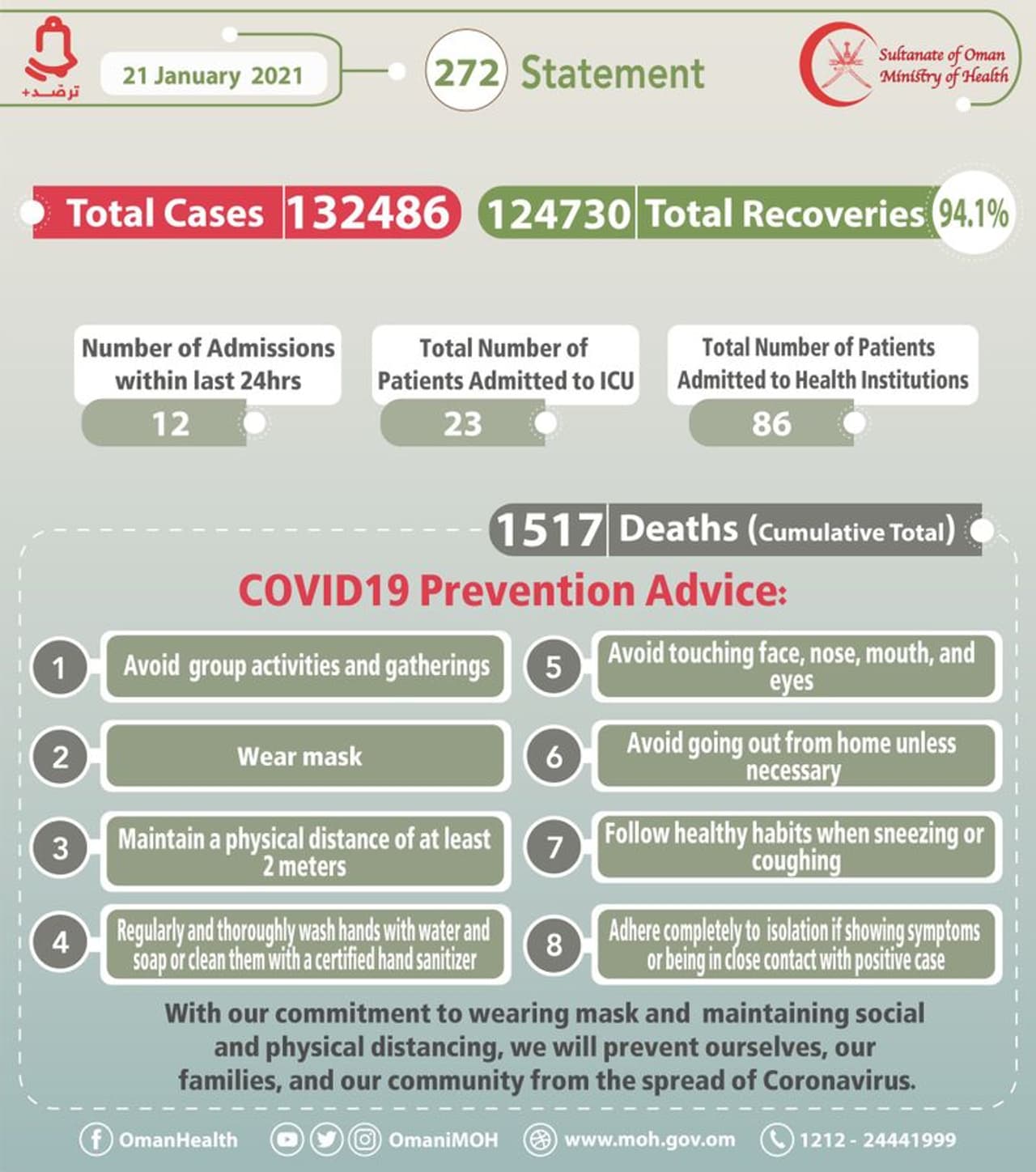 കഴിഞ്ഞ 24 മണിക്കൂറിനിടയില് കൊവിഡ് ബാധിച്ചു ഒരു മരണമാണ് റിപ്പോര്ട്ട് ചെയ്യപ്പെട്ടിട്ടുള്ളത്. ഇതോടെ കൊവിഡ് ബാധിച്ച് ഒമാനില് മരിച്ചവരുടെ എണ്ണം 1517 ആയി. കഴിഞ്ഞ 24 മണിക്കൂറിനുള്ളില് 151 പേര്ക്കാണ് രോഗം ഭേദമായത്. ഇവരുള്പ്പെടെ 1,24,730 പേര് രോഗമുക്തരായിട്ടുണ്ട്.രാജ്യത്തെ രോഗമുക്തി നിരക്ക് ഇപ്പോള് 94.1 ശതമാനമാണെന്നും പ്രസ്താവനയില് പറയുന്നു.
