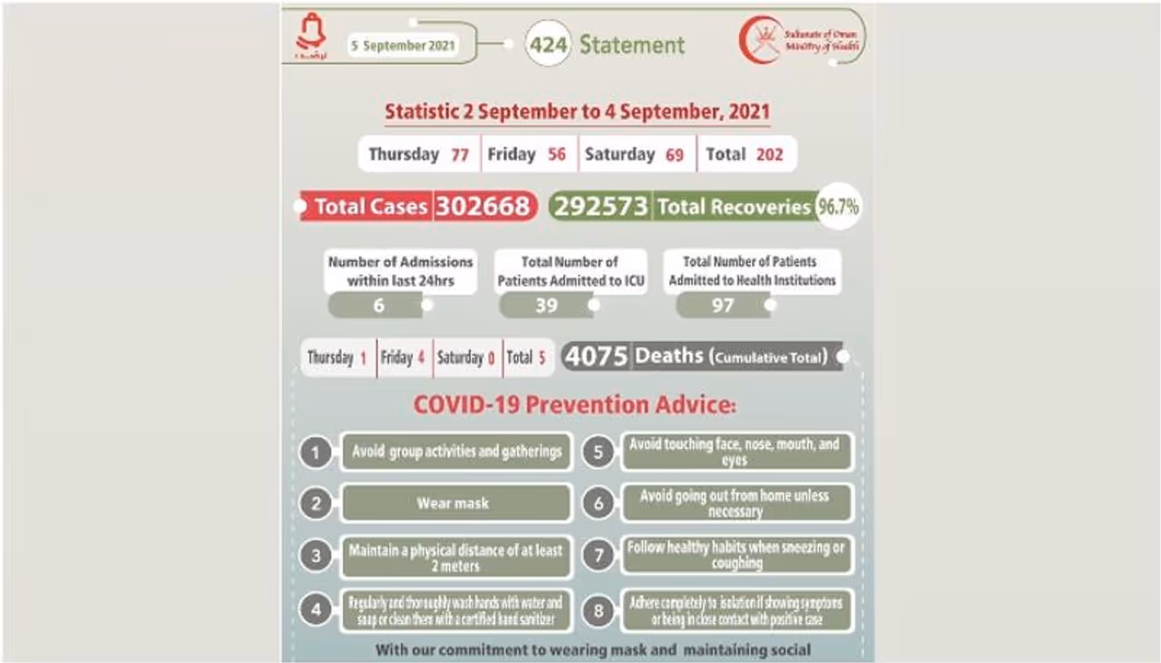 മസ്കത്ത്: ഒമാനില് കഴിഞ്ഞ 3 ദിവസത്തിനിടെ 202 പേര്ക്ക് കൊവിഡ് സ്ഥിരീകരിച്ചതായി ആരോഗ്യ മന്ത്രാലയം അറിയിച്ചു. അഞ്ച് കൊവിഡ് മരണങ്ങളാണ് രാജ്യത്ത് പുതിയതായി റിപ്പോര്ട്ട് ചെയ്യപ്പെട്ടത്. 392 പേര് കൂടി രോഗമുക്തി നേടി.
