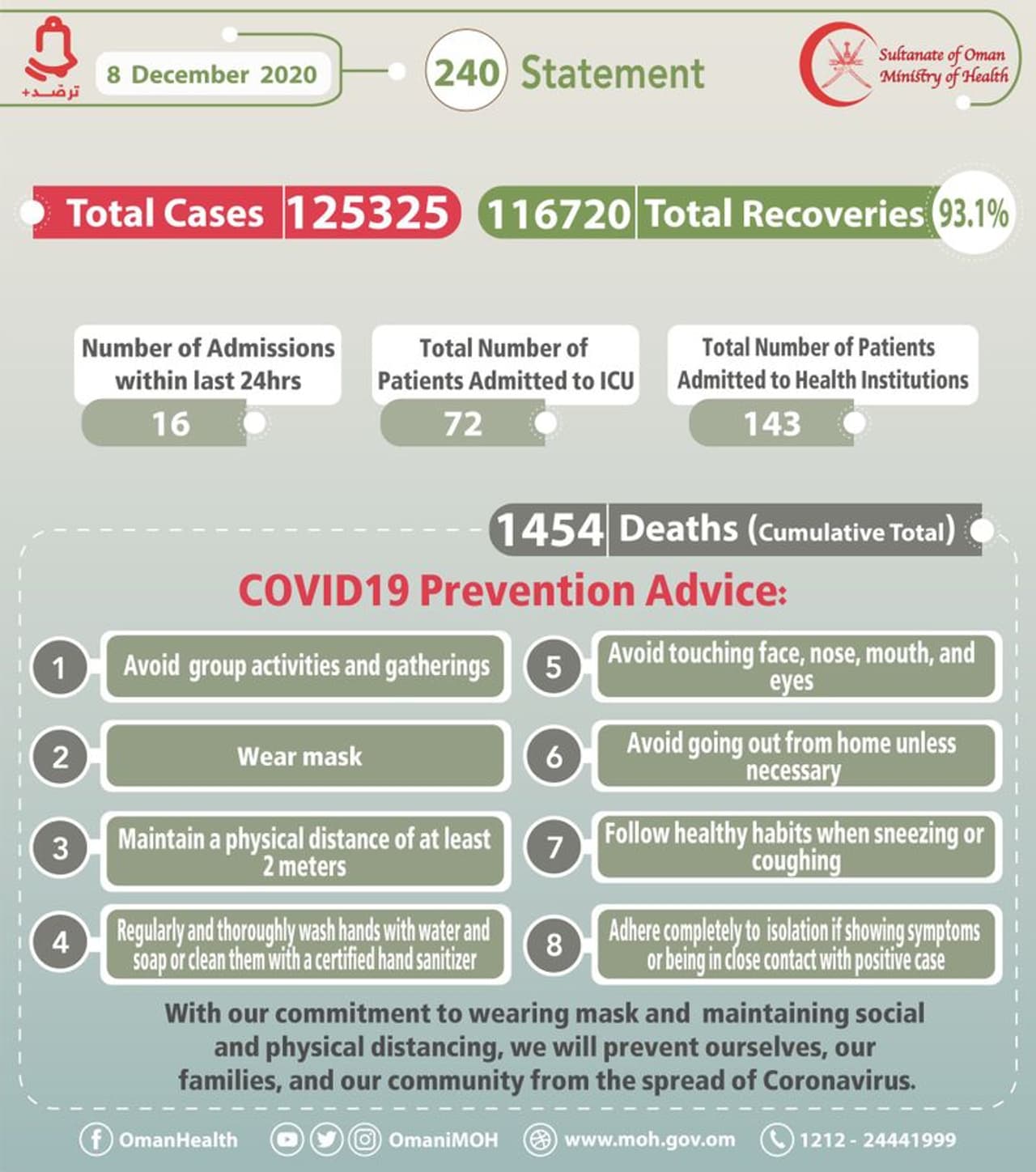 മസ്കത്ത്: ഒമാനില് രണ്ടുപേര് കൂടി കൊവിഡ് ബാധിച്ച് മരിച്ചതായി ആരോഗ്യ മന്ത്രാലയം ചൊവ്വാഴ്ച അറിയിച്ചു. 211 പേര്ക്ക് കൂടി പുതിയതായി രോഗം സ്ഥിരീകരിച്ചു. രാജ്യത്ത് ഇതുവരെ കൊവിഡ് സ്ഥിരീകരിക്കപ്പെട്ടവരുടെ എണ്ണം 125,326 ആയി. ആകെ 1454 പേരാണ് കൊവിഡ് ബാധിച്ച് മരണപ്പെട്ടത്.