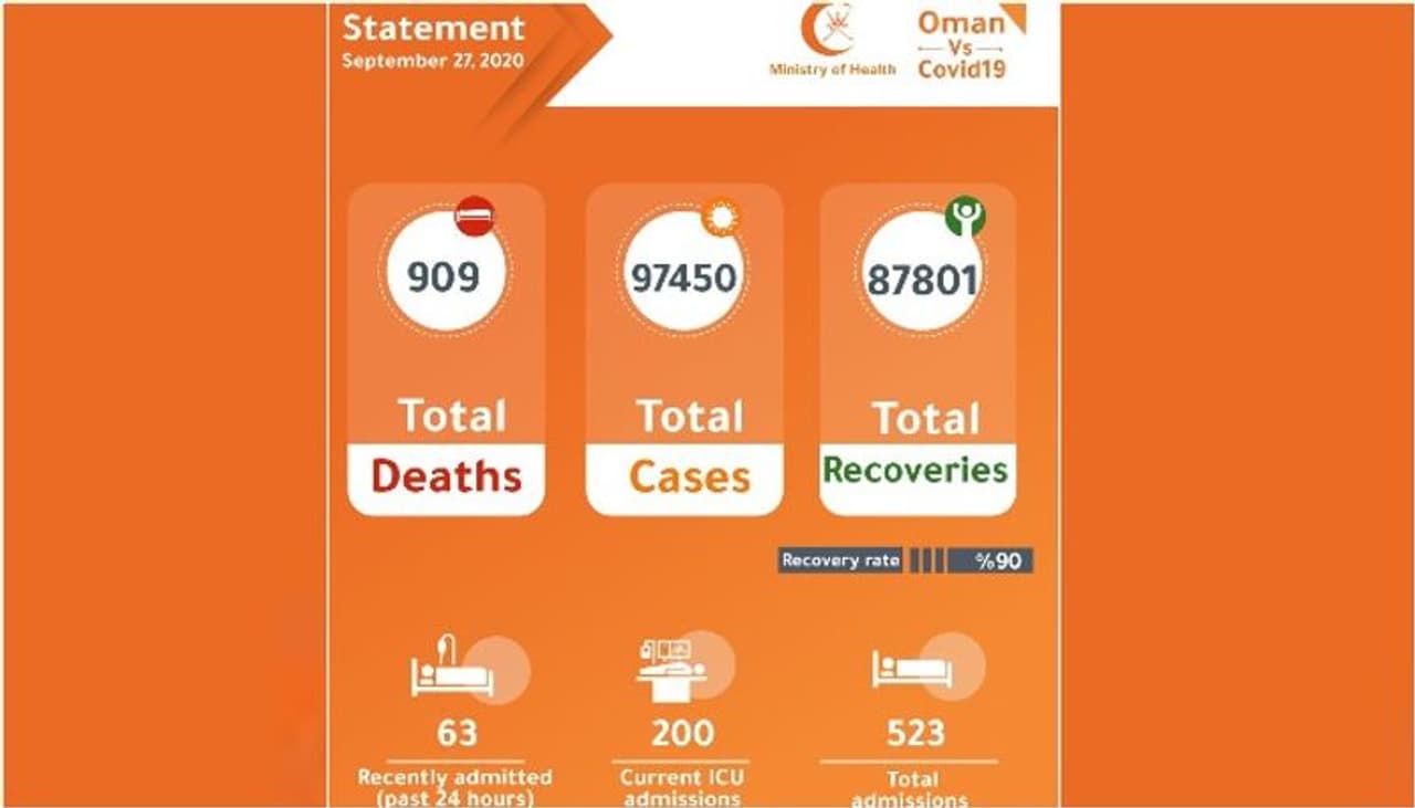 ആകെ രോഗമുക്തരായവരുടെ എണ്ണം 87801 ആയി ഉയര്ന്നു. 90 ശതമാനമാണ് രാജ്യത്തെ രോഗമുക്തി നിരക്ക്. കഴിഞ്ഞ 72 മണിക്കൂറില് ഒമാനില് 24 പേരാണ് കൊവിഡ് മൂലം മരണപ്പെട്ടത് കൊവിഡ് ബാധിച്ച് മരിച്ചവരുടെ എണ്ണം 909 ആയി. 523 പേരാണ് നിലവില് ആശുപത്രികളില് ചികിത്സയിലുള്ളത്. ഇതില് 200 പേര് തീവ്രപരിചരണ വിഭാഗത്തിലാണ്. കഴിഞ്ഞ 24 മണിക്കൂറിനുള്ളില് 63 കൊവിഡ് രോഗികളെ രാജ്യത്തെ വിവിധ ആശുപത്രികളില് പ്രവേശിപ്പിച്ചു.