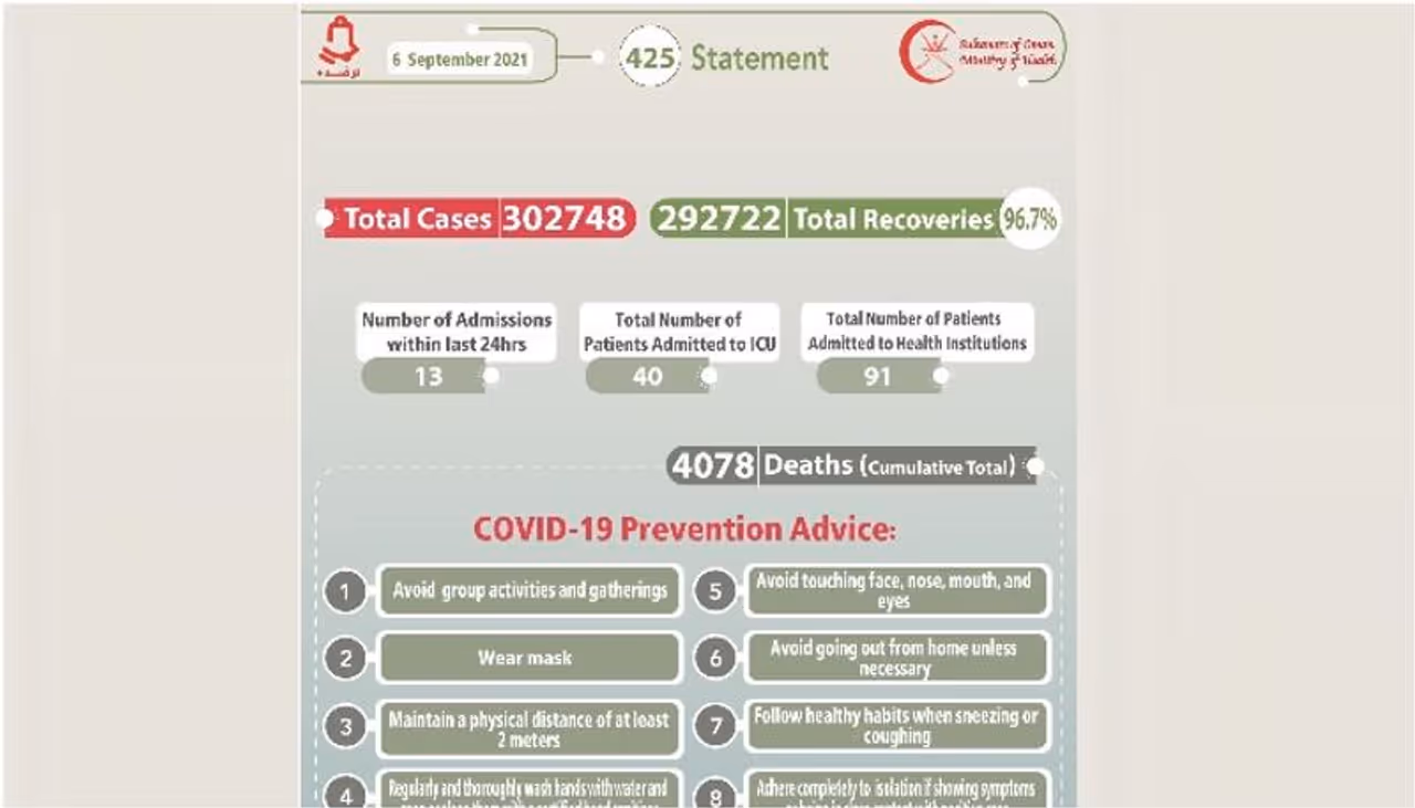 ഇതുവരെയുള്ള കണക്കുകള് പ്രകാരം രാജ്യത്ത് കൊവിഡ് സ്ഥിരീകരിച്ചത് 3,02,748 പേര്ക്കാണ്. ഇവരില് 2,92,722 പേരും ഇതിനോടകം രോഗമുക്തരായി. 4,078 പേര്ക്കാണ് കൊവിഡ് കാരണം ഒമാനില് ജീവന് നഷ്ടമായത്. 96.7 ശതമാനമാണ് ഇപ്പോഴത്തെ രോഗമുക്തി നിരക്ക്. കഴിഞ്ഞ 24 മണിക്കൂറിനിടെ 13 കൊവിഡ് രോഗികളെ മാത്രമാണ് ആശുപത്രികളില് പ്രവേശിപ്പിക്കേണ്ടി വന്നത്. ഇവര് ഉള്പ്പെടെ 91 പേര് ഇപ്പോള് രാജ്യത്തെ വിവിധ ആശുപത്രികളില് ചികിത്സയിലുണ്ട്. ഇവരില് 40 പേരാണ് തീവ്രപരിചരണ വിഭാഗങ്ങളിലുള്ളത്.