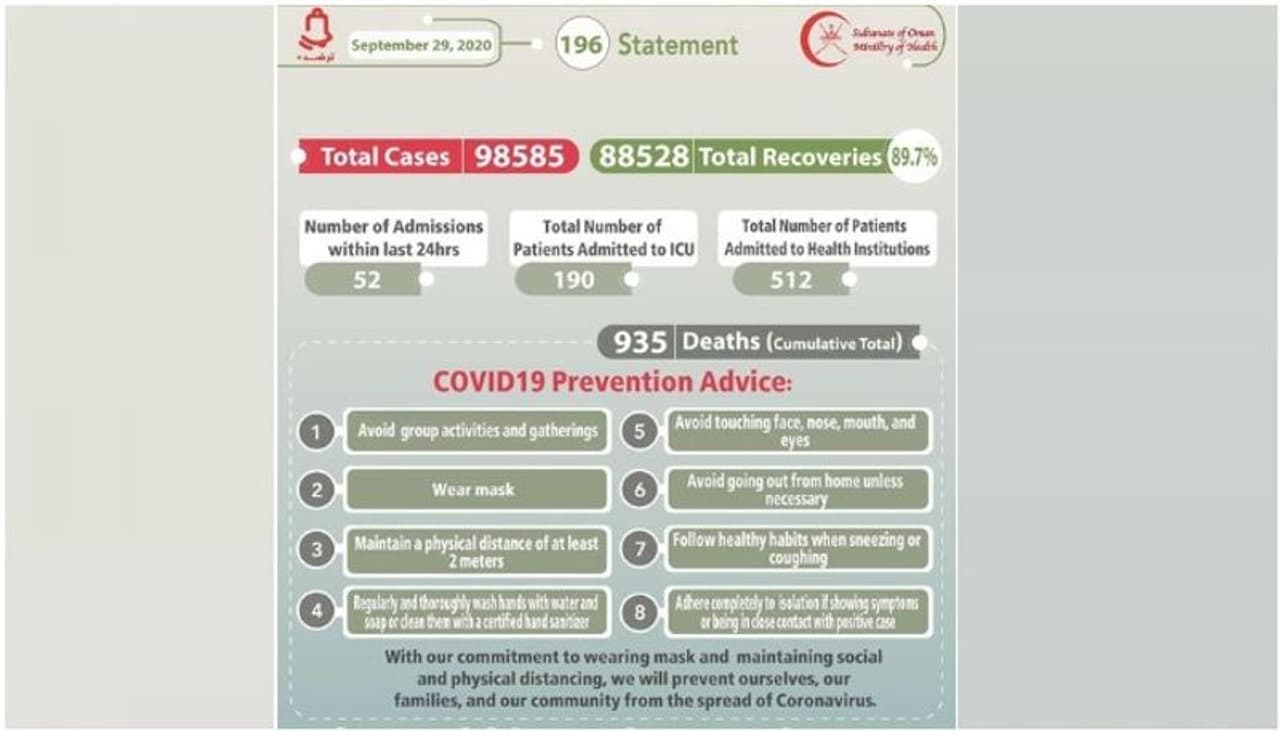 ആകെ രോഗമുക്തരായവരുടെ എണ്ണം 88528 ആയി. 89.7 ശതമാനമാണ് രാജ്യത്തെ രോഗമുക്തി നിരക്ക്. കഴിഞ്ഞ 24 മണിക്കൂറില് ഒമാനില് 11 പേരാണ് കൊവിഡ് മൂലം മരണപ്പെട്ടത്. കൊവിഡ് ബാധിച്ച് മരിച്ചവരുടെ എണ്ണം 935 ആയി. 512 പേരാണ് നിലവില് ആശുപത്രികളില് ചികിത്സയിലുള്ളത്. ഇതില് 190 പേര് തീവ്രപരിചരണ വിഭാഗത്തിലാണ്. കഴിഞ്ഞ 24മണിക്കൂറിനുള്ളില് 52 കൊവിഡ് രോഗികളെ രാജ്യത്തെ വിവിധ ആശുപത്രികളില് പ്രവേശിപ്പിച്ചു.