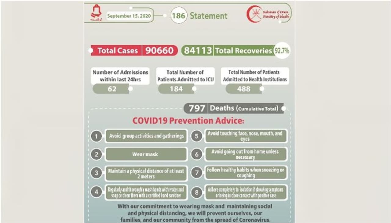 മസ്കറ്റ്: ഒമാനില് കൊവിഡ് ബാധിച്ച് ഇന്ന് ഏഴ് മരണം കൂടി റിപ്പോര്ട്ട് ചെയ്തു. 438 പേര്ക്ക് പുതുതായി രോഗം സ്ഥിരീകരിച്ചു. രാജ്യത്ത് ആകെ കൊവിഡ് സ്ഥിരീകരിച്ചവരുടെ എണ്ണം 90,660 ആയി. 185 പേര്ക്ക് കൂടി രോഗം ഭേദമായി.