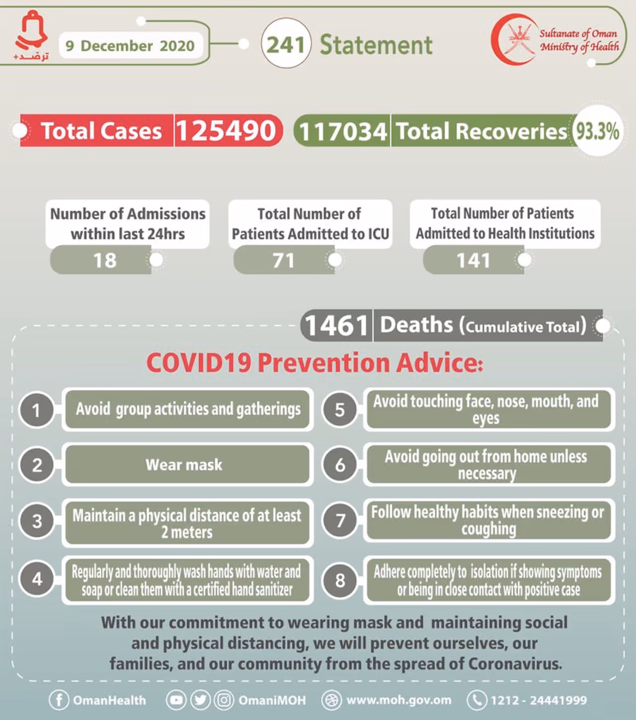 മസ്കറ്റ്: ഒമാനില് ഏഴുപേര് കൂടി കൊവിഡ് ബാധിച്ച് മരിച്ചതായി ആരോഗ്യ മന്ത്രാലയം ബുധനാഴ്ച അറിയിച്ചു. 164 പേര്ക്ക് കൂടി പുതിയതായി രോഗം സ്ഥിരീകരിച്ചു. രാജ്യത്ത് ഇതുവരെ കൊവിഡ് സ്ഥിരീകരിക്കപ്പെട്ടവരുടെ എണ്ണം 125,490 ആയി. ആകെ 1461 പേരാണ് കൊവിഡ് ബാധിച്ച് മരണപ്പെട്ടത്.