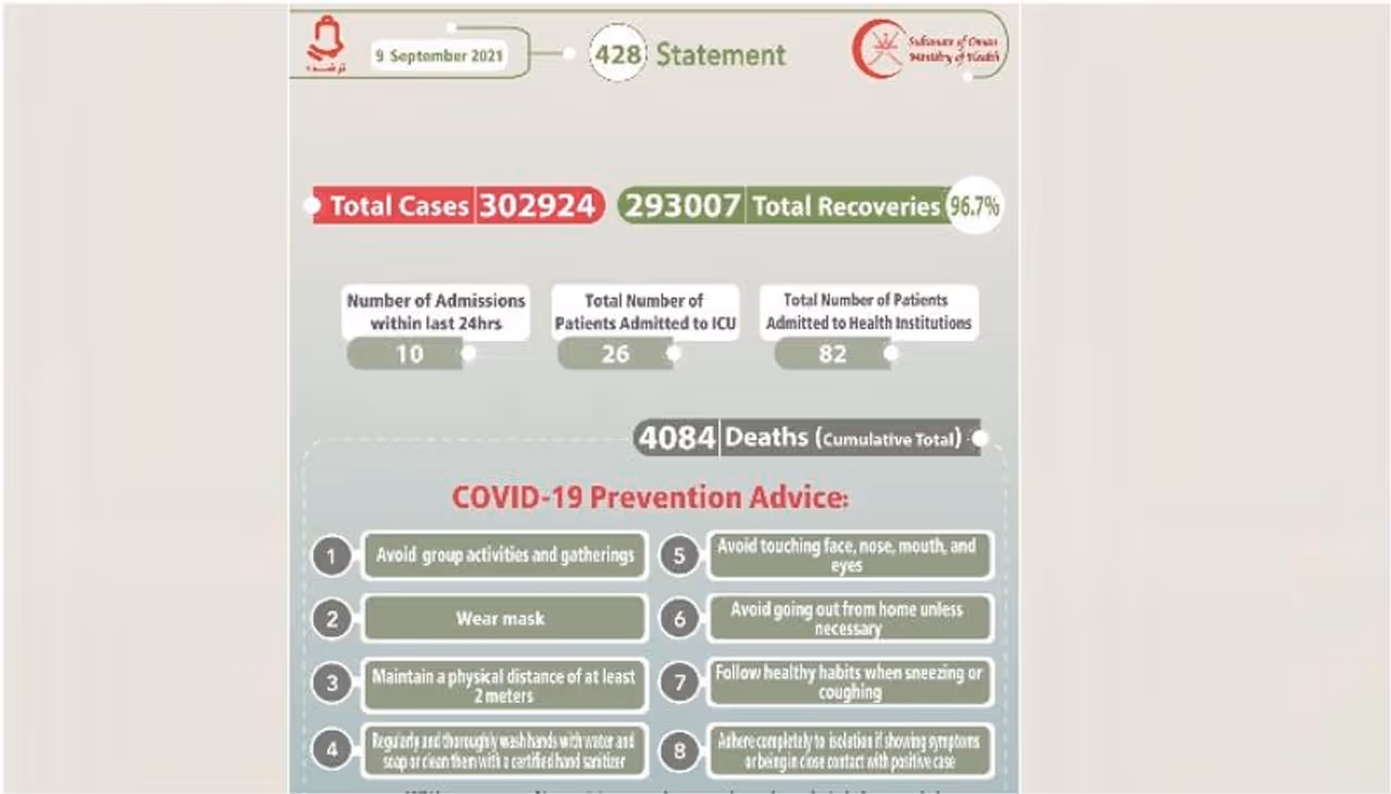 4,084 പേര്ക്കാണ് കൊവിഡ് കാരണം ഒമാനില് ജീവന് നഷ്ടമായത്. 96.7 ശതമാനമാണ് ഇപ്പോഴത്തെ രോഗമുക്തി നിരക്ക്.