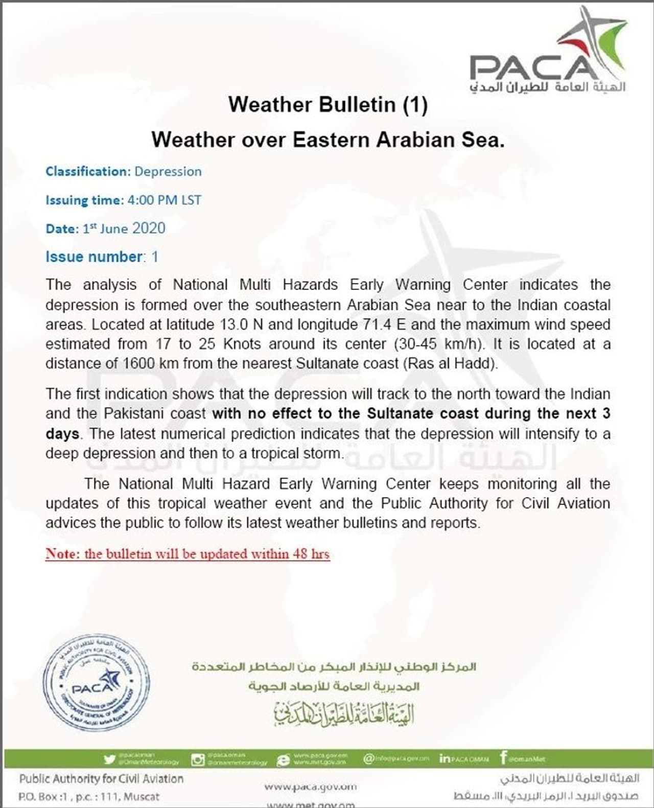 ഇത് അടുത്ത മൂന്നു ദിവസത്തേക്ക് ഒമാനെ നേരിട്ട് ബാധിക്കുകയില്ല. നിലവിൽ കാറ്റിന്റെ വേഗത 45 കിലോമീറ്റർ വരെയാണ്. ജനങ്ങൾ ജാഗ്രത പുലർത്തുവാൻ അധികൃതർ അറിയിപ്പും നൽകിയിട്ടുണ്ട്.