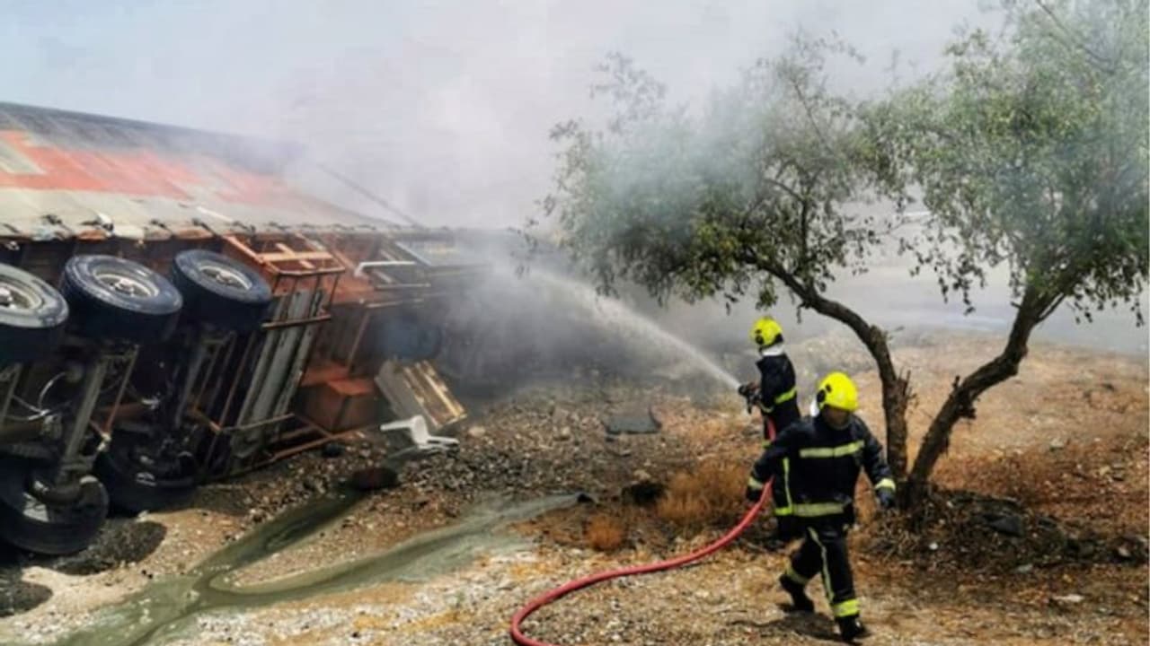 അപകടത്തെ തുടര്ന്ന് ട്രക്കിന് തീപിടിക്കുകയായിരുന്നു. അപകടം സംബന്ധിച്ച് വിവരം ലഭിച്ചയുടന് ചന്നെ സിവിൽ ഡിഫൻസ് ആന്റ് ആംബുലൻസ് ഡയറക്ടറേറ്റിലെ അഗ്നിശമന സേനാംഗങ്ങള് സ്ഥലത്തെത്തി രക്ഷാപ്രവര്ത്തനം നടത്തി.