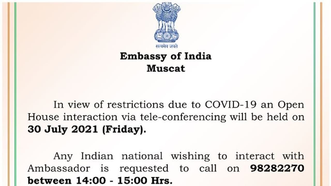 ജൂലൈ 30, വെള്ളിയാഴ്ച ഉച്ചക്ക് ശേഷം രണ്ട് മണിക്ക് മസ്കറ്റ് ഇന്ത്യന് എംബസിയില് ആരംഭിക്കുന്ന ഓപ്പണ് ഹൗസില് പ്രവാസികളുടെ ക്ഷേമവുമായി ബന്ധപ്പെട്ട ഏത് കാര്യങ്ങളും ഉന്നയിക്കുവാന് സാധിക്കും.