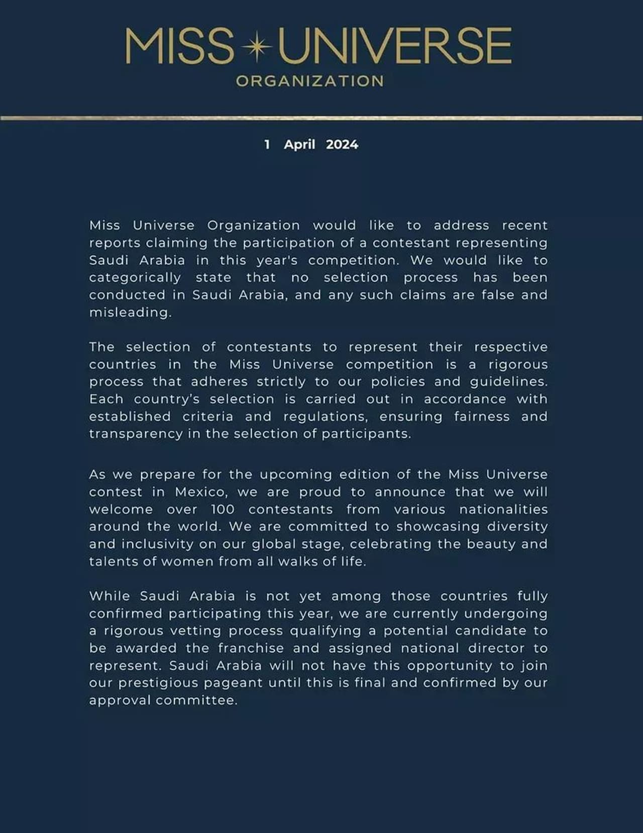 സൗദി മോഡലായ റൂമി അല്ഖഹ്താനിയുടെ സോഷ്യൽ മീഡിയ പോസ്റ്റിനെ തുടർന്നുള്ളതായിരുന്നു വാർത്തകൾ. ഈ വർഷത്തെ മിസ് യൂനിവേഴ്സ് സൗന്ദര്യ മത്സരത്തിൽ സൗദി അറേബ്യ പങ്കെടുക്കുന്നുവെന്ന റിപ്പോർട്ടുകൾ തള്ളിക്കളയുകയാണെന്ന് സംഘാടകർ പറഞ്ഞു.