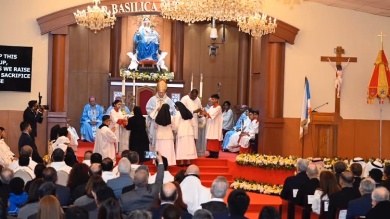 കുവൈത്ത് സിറ്റി: കുവൈത്തിലെ അഹമ്മദിയിലുള്ള ഔർ ലേഡി ഓഫ് അറേബ്യ ദേവാലയത്തെ 'മൈനർ ബസിലിക്ക' പദവിയിലേക്ക് ഔദ്യോഗികമായി ഉയർത്തി. വത്തിക്കാൻ സ്റ്റേറ്റ് സെക്രട്ടറി കർദിനാൾ പിയട്രോ പരോളിൻ മുഖ്യകാർമ്മികത്വം വഹിച്ച പ്രഖ്യാപന ചടങ്ങ് കുവൈത്തിലെ ക്രൈസ്തവ സമൂഹത്തിന് സമാനതകളില്ലാത്ത ചരിത്ര നിമിഷമായി മാറി. അറേബ്യൻ ഉപദ്വീപിൽ ഈ പദവി ലഭിക്കുന്ന ആദ്യ ദേവാലയമാണിത്.