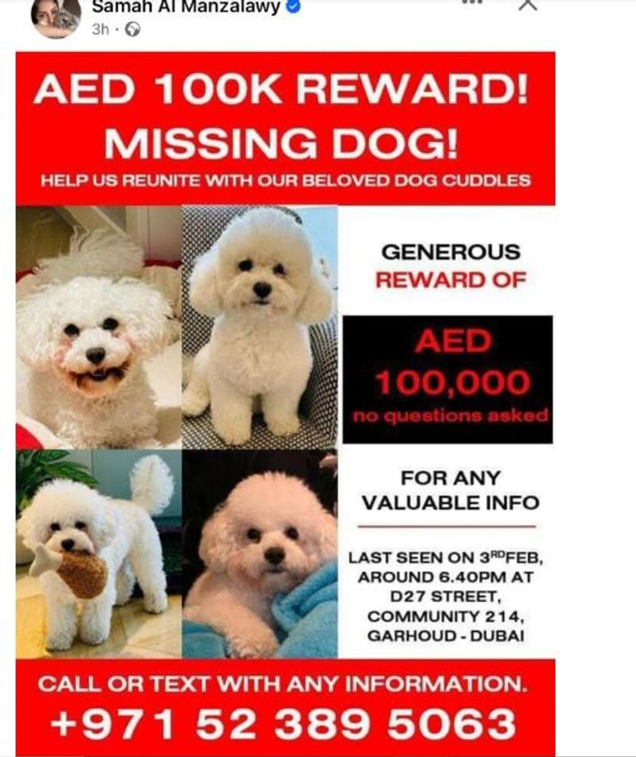 നായയെ കണ്ടെത്താനുള്ള ശ്രമങ്ങള് പരാജയപ്പെട്ടതോടെയാണ് അജ്ഞാതനായി തുടരാൻ ആഗ്രഹിക്കുന്ന ഉടമ പാരിതോഷികം പ്രഖ്യാപിച്ചത്. 'കുടുംബത്തിന് വളരെയേറെ പ്രിയപ്പെട്ടതാണ് കഡില്ഡ്. നായയെ നഷ്ടപ്പെട്ടതില് കുടുംബം ദുഃഖിതരാണ്'- 100,000 ദിര്ഹം പാരിതോഷികം നല്കുമെന്ന വിവരം സ്ഥിരീകരിച്ച് കൊണ്ട് നായയുടെ ഉടമയുടെ വക്താവ് പറഞ്ഞു. ഇതിനു മുമ്പും സമാന രീതിയിൽ നായയെ കാണാതായിരുന്നു. തുടർന്ന് കുടുംബം 1000 ദിർഹം പാരിതോഷികം പ്രഖ്യാപിച്ചു. എന്നാല് 10 ദിവസത്തിനകം നായയെ കണ്ടെത്താനായി.