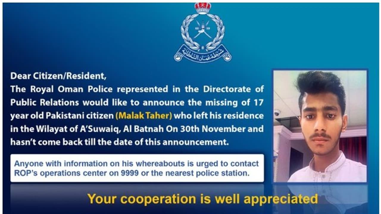 മാലിക്ക് താഹിറിനെ പറ്റി എന്തെങ്കിലും വിവരം ലഭിക്കുന്നവര് അടുത്തുള്ള പൊലീസ് സ്റ്റേഷനിലോ 9999 എന്ന നമ്പറിലോ ബന്ധപ്പെടണമെന്ന് റോയല് ഒമാന് പൊലീസ് ആവശ്യപ്പെട്ടു.