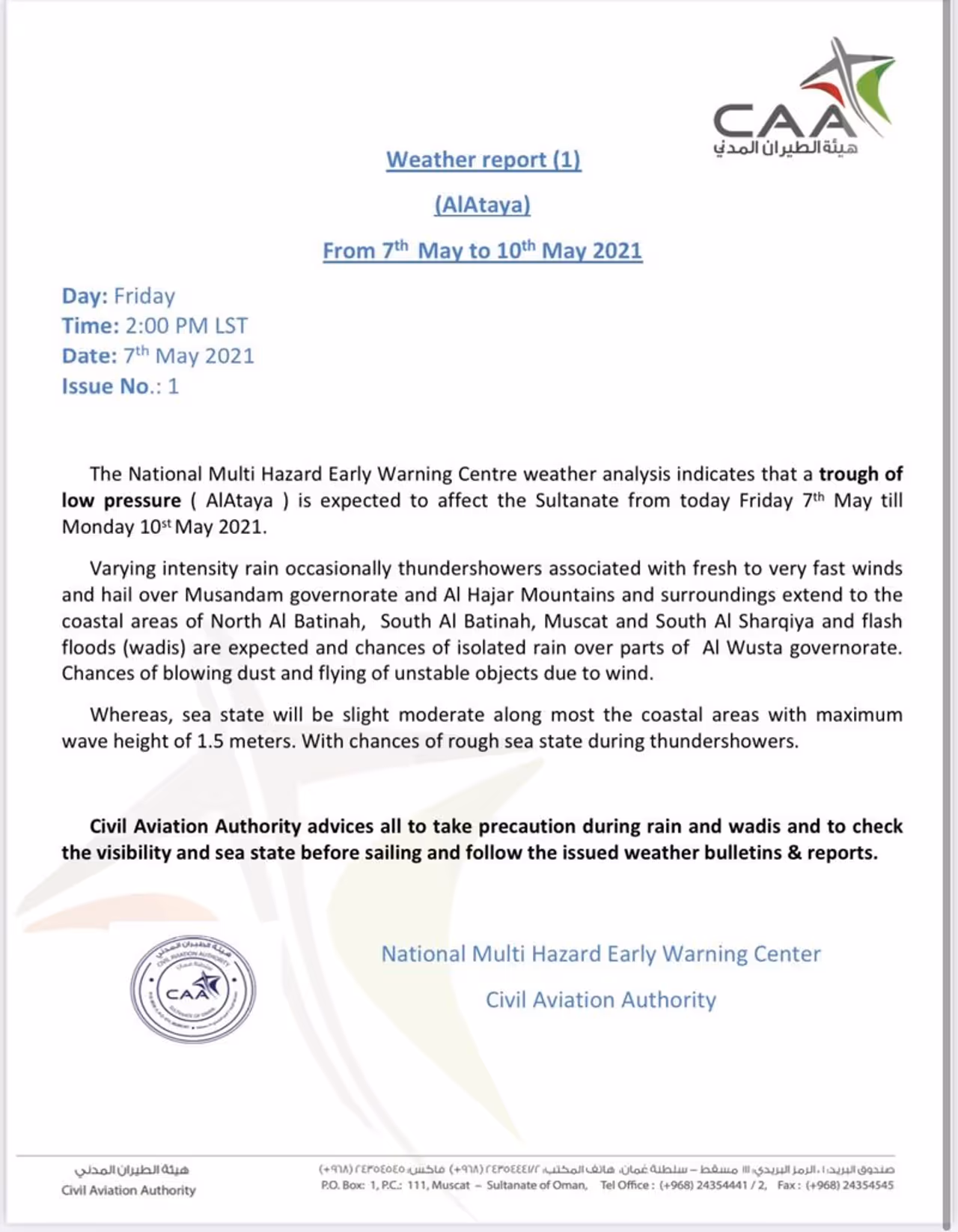 പ്രതികൂല കാലാവസ്ഥ നിലനില്ക്കുന്നതിനാല് മത്സ്യത്തൊഴിലാളികള് കടലില് പോകരുതെന്ന് കാര്ഷിക, മത്സ്യ മന്ത്രാലയം മുന്നറിയിപ്പ് പ്രസ്താവനയും പുറത്തിറക്കിയിട്ടുണ്ട്. വാഹനങ്ങള് വാദികള് മുറിച്ചു കടക്കുന്നത് സുരക്ഷാനിര്ദേശം അനുസരിച്ചു മാത്രം ആയിരിക്കണമെന്നും സിവില് ഏവിയേഷന് അതോറിറ്റി അറിയിച്ചു.