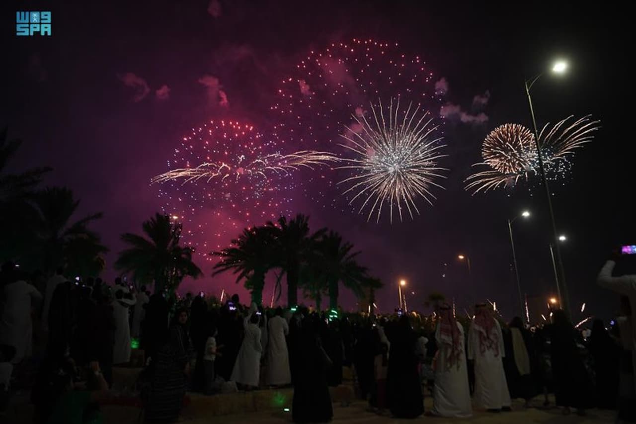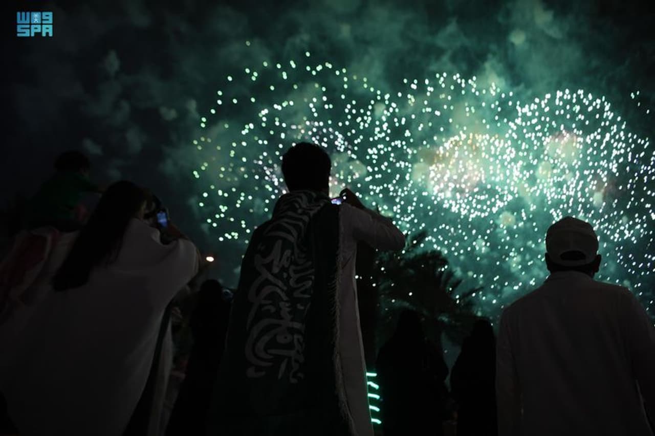 രാജ്യത്തെ 18 നഗരങ്ങളിലാണ് വിവിധതരം കരിമരുന്ന് പ്രയോഗങ്ങളിലൂടെ ആകാശത്ത് വര്ണവിസ്മയങ്ങള് തീര്ത്തത്. പ്രധാന പരിപാടികളിലൊന്നായിരുന്നു വെടിക്കെട്ട്. ദേശീയ ദിനമായ വെള്ളിയാഴ്ച രാത്രി ഒമ്പതിനാണ് വെടിക്കെട്ട് ആരംഭിച്ചത്. അഞ്ച് മുതല് 15 മിനുറ്റ് വരെ നീണ്ടുനിന്നു മാനത്ത് മാരിവില്ലഴക് വിരിയിച്ച കമ്പക്കെട്ട്. മാനത്ത് ആയിരക്കണക്കിന് നക്ഷത്രങ്ങള് പൊട്ടിവിരിഞ്ഞു. പൂവാടികള് വിരിഞ്ഞുനിറഞ്ഞു. പച്ച വസ്ത്രം ധരിച്ചും സൗദി പതാക ഉയര്ത്തിയും 'ഇത് ഞങ്ങളുടെ വീടാണ്' എന്ന എന്നെഴുതിയ ബാനറുകള് വഹിച്ചും നിരവധി കുടുംബങ്ങളും കുട്ടികളും വിവിധ നഗരങ്ങളിലെ വെടിക്കെട്ടുകള് കാണാനെത്തിയിരുന്നു.
