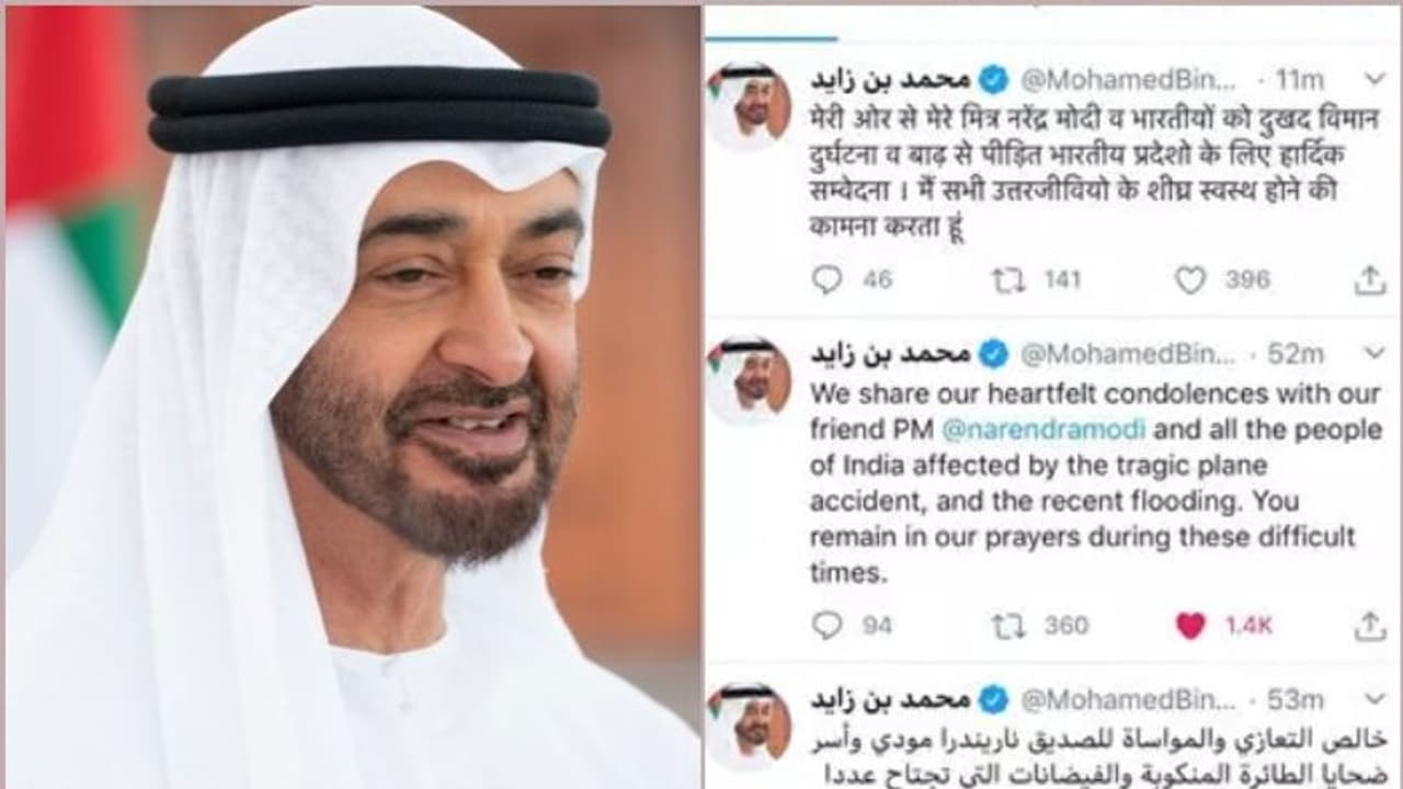 വിമാന, മഴക്കെടുതി ദുരന്തങ്ങളില് അനുശോചനം രേഖപ്പെടുത്തിയ ശൈഖ് മുഹമ്മദ് ഈ ദുരിതകാലത്ത് ഞങ്ങളുടെ പ്രാര്ത്ഥനകളില് നിങ്ങളും ഉണ്ടാകുമെന്നും ട്വീറ്റ് ചെയ്തു. അറബിക്കും ഇംഗ്ലീഷിനും പുറമെ ഇന്ത്യന് ഭാഷകളിലും അനുശോചന സന്ദേശം പങ്കുവെച്ചിട്ടുണ്ട്.