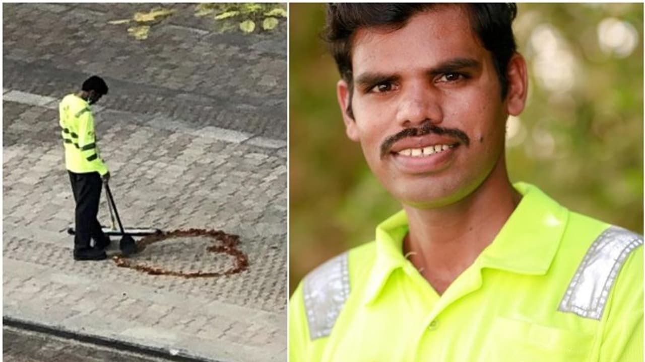 ജൂലൈ 15ന് ദുബായില് തന്റെ ഒരു ദിവസത്തെ ഓഫീസ് ജോലികള് തീര്ക്കുന്ന തിരക്കിനിടയില് നെസ്മ ഫറാഹത് എന്ന വ്യക്തി ജനാലയിലൂടെ ഒരു കാഴ്ച കണ്ടു. ശുചീകരണ തൊഴിലാളിയായ ഒരാള് നിലത്ത് വീണ് കിടന്ന കരിയിലകള് ചേര്ത്ത് വെച്ച് ഹൃദയത്തിന്റെ ആകൃതിയില് ഒരു ചിത്രം നിര്മ്മിക്കുന്നു. കൗതുകം ജനിപ്പിച്ച ആ രംഗം നെസ്മ ക്യാമറയില് പകര്ത്തി. പിന്നീട് സാമൂഹിക മാധ്യമങ്ങളില് ചിത്രം വൈറലായി. നിരവധി അന്വേഷണങ്ങള്ക്കൊടുവില് അബുദാബി കേന്ദ്രീകരിച്ച് പ്രവര്ത്തിക്കുന്ന ഇംഗ്ലീഷ് മാധ്യമം 'ദി നാഷണല്' ശുചീകരണ തൊഴിലാളിയായ ആ വ്യക്തിയെ കണ്ടെത്തി.