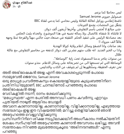 പിന്നീട് മണിക്കൂറുകള്ക്ക് ശേഷം കേരള മാധ്യമങ്ങള് പരിശോധിച്ചപ്പോഴാണ് മോചനത്തിനുള്ള പണമായി സാവുമല് ജെറോം 20,000 ഡോളര് ശേഖരിക്കാന് അഭ്യര്ത്ഥിച്ച വിവരം അറിഞ്ഞതെന്നും വര്ഷങ്ങളായി ഇയാള് തങ്ങളുടെ ചിന്തിയ രക്തം മധ്യസ്ഥത എന്ന പേരില് വ്യാപാരം നടത്തുകയാണെന്നും അബ്ദുൽ ഫത്താഹ് മഹ്ദി ഫേസ്ബുക്കില് കുറിച്ചു. തങ്ങള്ക്ക് സത്യം അറിയാമെന്നും അദ്ദേഹം നുണ പറയുന്നതും വഞ്ചനയും അവസാനിപ്പിച്ചില്ലെങ്കില് സത്യം വെളിപ്പെടുത്തുമെന്നും പറഞ്ഞാണ് കുറിപ്പ് അവസാനിപ്പിക്കുന്നത്.
